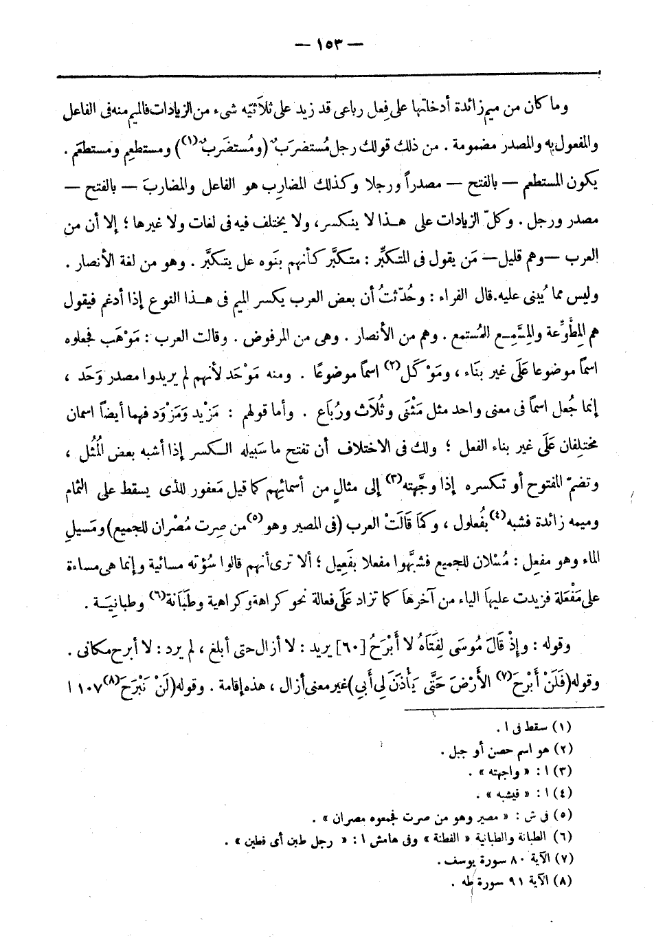 يكون المستطعم- بالفتح- مصدرًا ورجلًا وكذلك المضارب هُوَ الفاعل والمضارب- بالفتح- مصدر ورجل. وكل الزيادات عَلَى هَذَا لا ينكسر، ولا يَختلف فِيهِ فِي لغات ولا غيرها إلا أن من العرب- وهم قليل- من يقول في المتكبِّر: متكبَّر كأنهم بنوه عل يتكبَّر. وهو من لغة الأنصار.