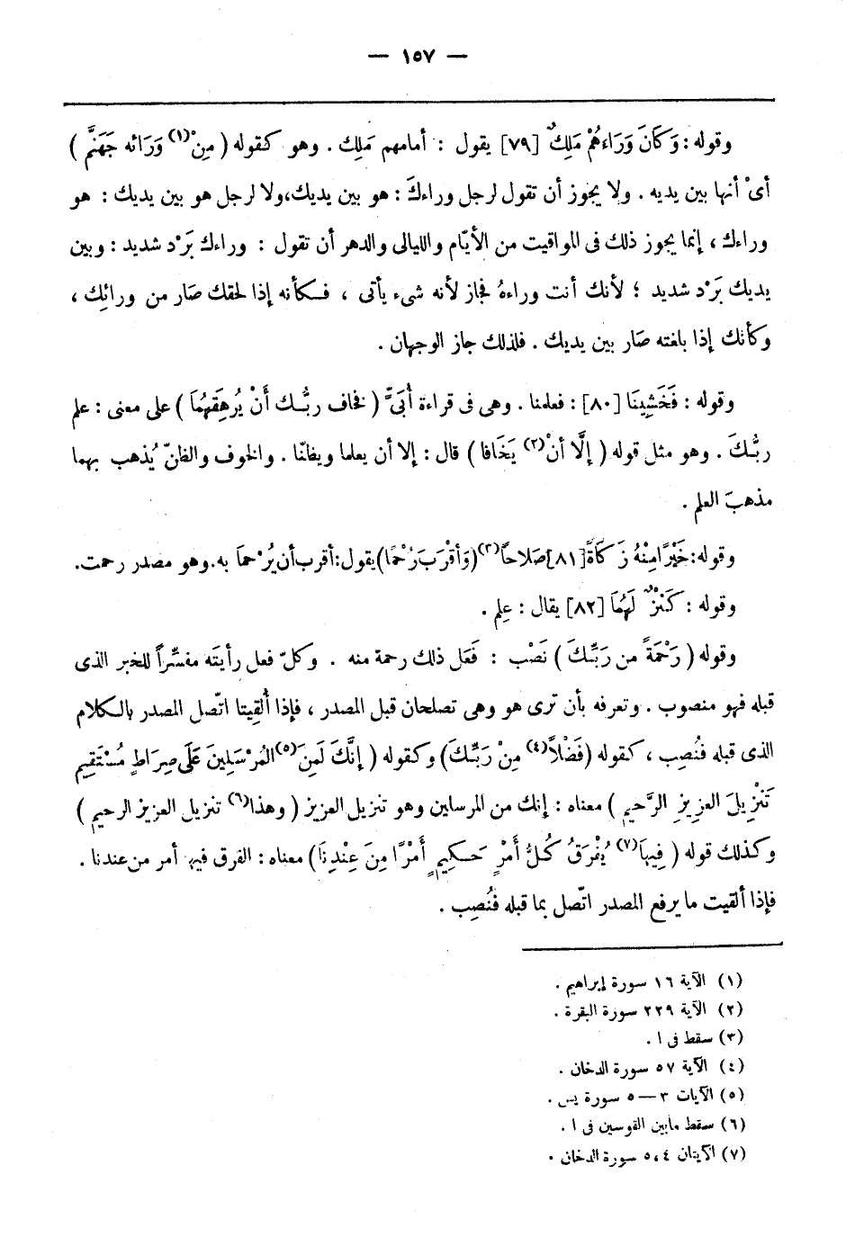 وقوله (رَحْمَةً مِنْ رَبِّكَ) نصب: فَعَل ذَلِكَ رحمة منه. وكل فعل رأيته مفسِّرًا للخبر الَّذِي قبله فهو منصوب. وتعرفه بأن ترى هُوَ وهي تصلحان قبل المصدر، فإذا ألقيتا اتّصل المصدر بالكلام الَّذِي قبله فنصب، كقوله (فَضْلًا «4» مِنْ رَبِّكَ) وكقوله (إِنَّكَ لَمِنَ «5» الْمُرْسَلِينَ عَلى صِراطٍ مُسْتَقِيمٍ تَنْزِيلَ الْعَزِيزِ الرَّحِيمِ) معناهُ: إنك من المرسلين وهو تنزيل العزيز (وهذا «6» تنزيل العزيز الرحيم) وكذلك قوله (فِيها «7» يُفْرَقُ كُلُّ أَمْرٍ حَكِيمٍ أَمْراً مِنْ عِنْدِنا) معناهُ: الفرق فيها أمر من عندنا.
