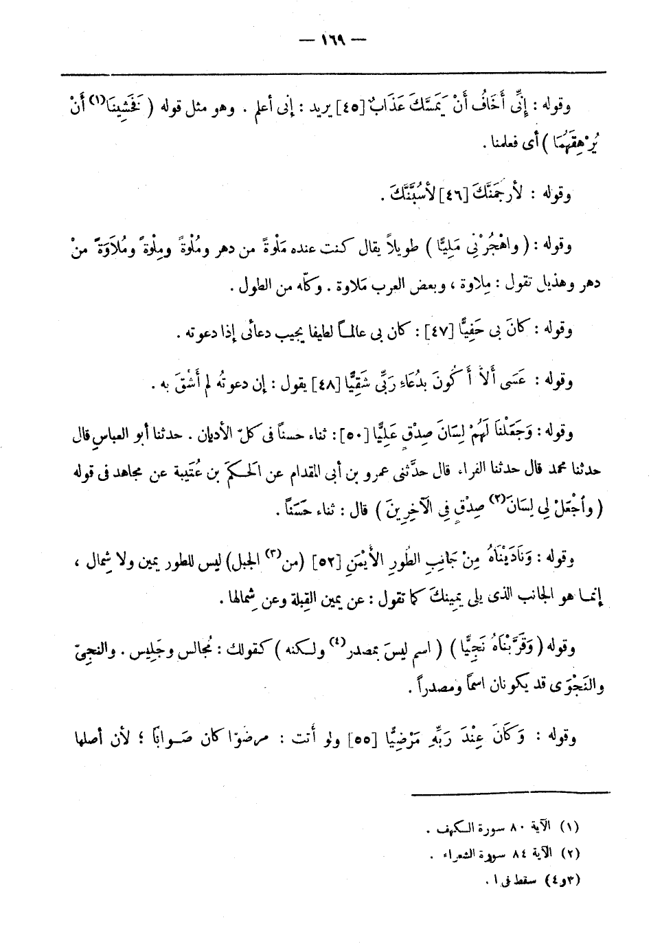 وقوله: وَجَعَلْنا لَهُمْ لِسانَ صِدْقٍ عَلِيًّا [50] : ثناء حسنا فى كلّ الأديان. حَدَّثَنَا أَبُو الْعَبَّاسِ قَالَ حَدَّثَنَا مُحَمَّدٌ قَالَ حَدَّثَنَا الْفَرَّاءُ قَالَ حَدَّثَنِي عَمْرو بن أبي المقدام عَن الحكم بن عُتيبة عَن مُجاهد فِي قوله (وَاجْعَلْ لِي لِسانَ «2» صِدْقٍ فِي الْآخِرِينَ) قَالَ: ثناء حَسَنًا.