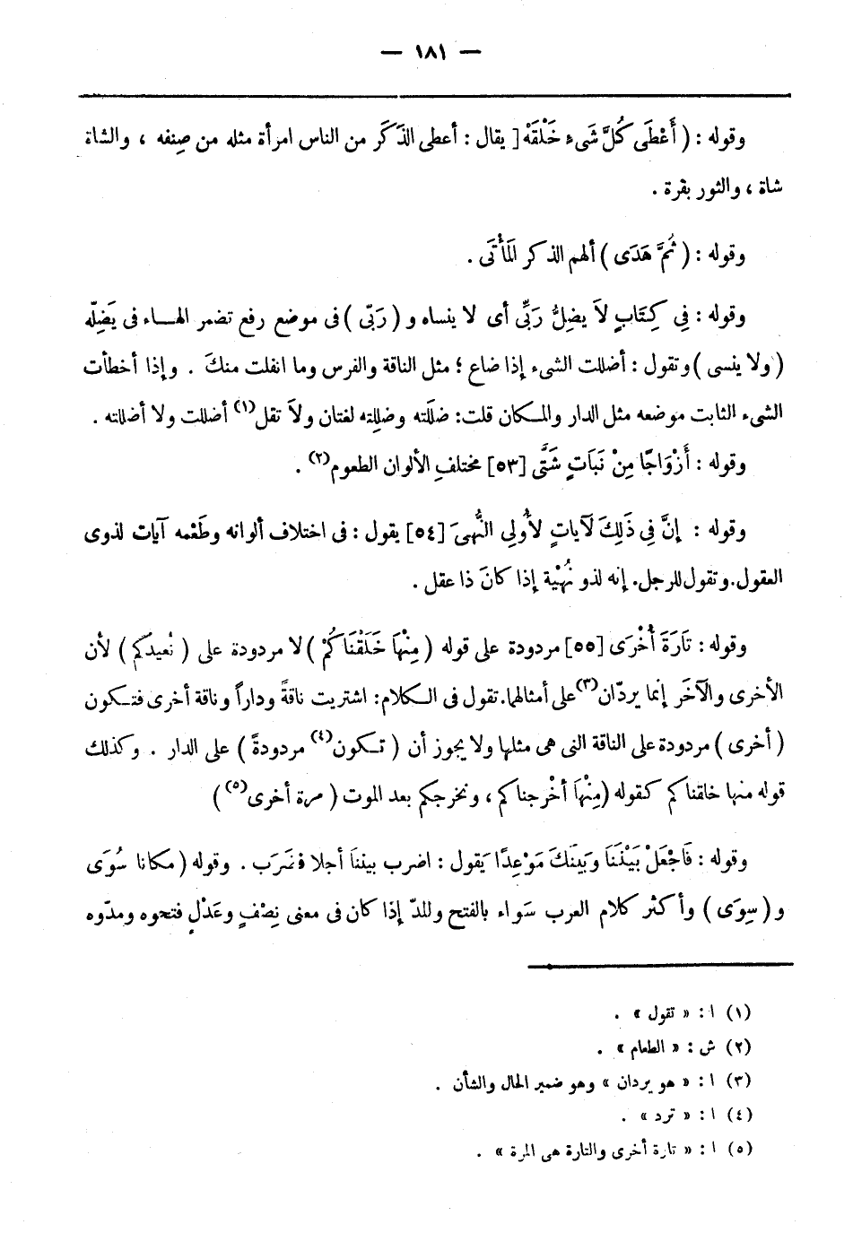 وقوله: تارَةً أُخْرى [55] مردودة على قوله (مِنْها خَلَقْناكُمْ) لا مردودة على (نُعِيدُكُمْ) لأن الأخرى والآخر إنما يردّان «3» عَلَى أمثالهما. تَقُولُ فِي الكلام: اشتريت ناقةً ودارًا وناقة أخرى فتكون (أُخْرى) مردودة عَلَى الناقة التي هي مثلها ولا يَجوز أن (تكون «4» مردودة) على الدار. وكذلك قوله منها خلقناكم كقوله (منها أخرجناكم، ونخرجكم بعد الموت (مرة أخرى «5» )