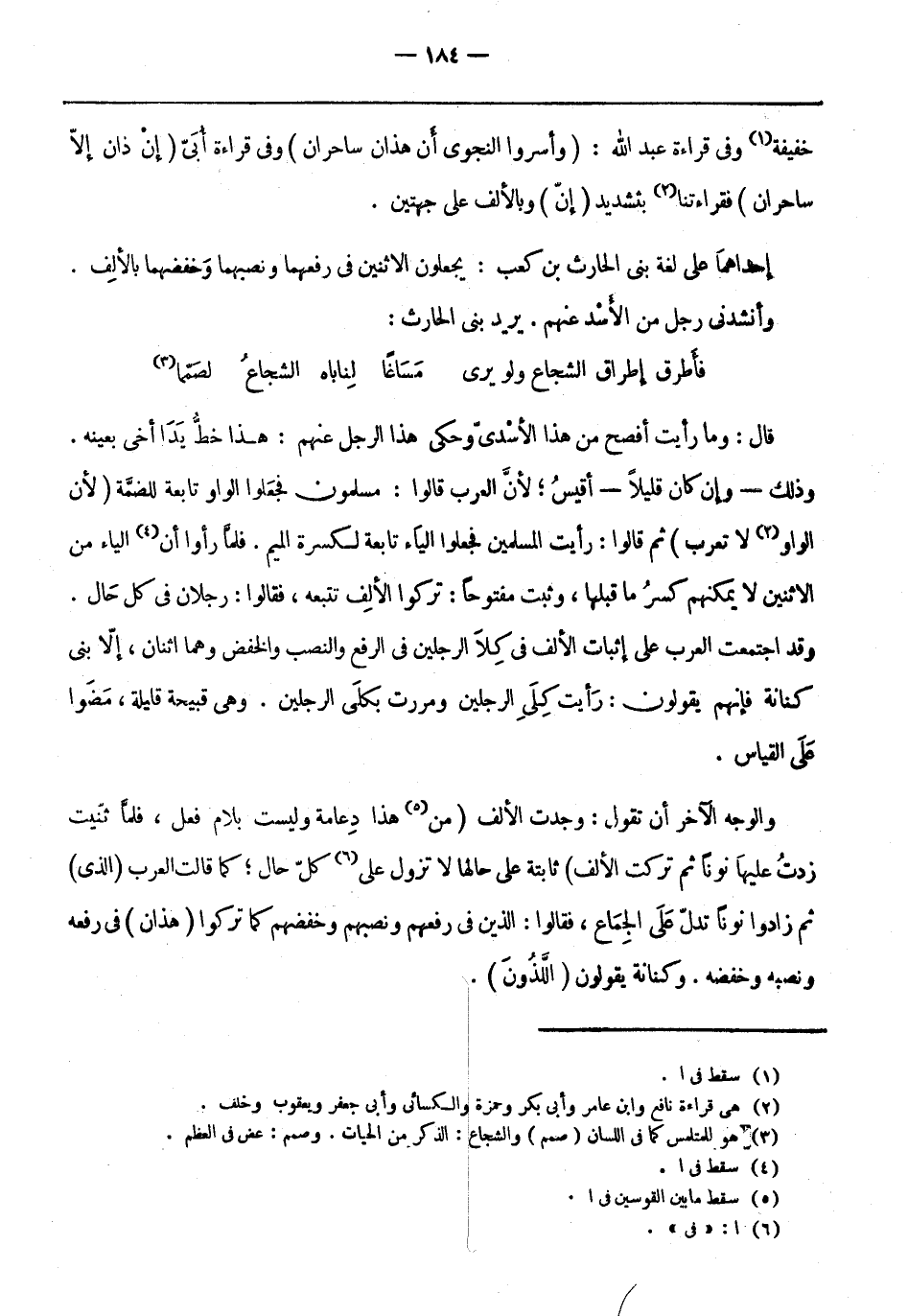 وَذَلِكَ- وإن كَانَ قليلًا- أقيس لأن العرب قالوا: مسلمون فجعلوا الواو تابعة للضمة (لأن الواو «4» لا تُعرب) ثُمَّ قالوا: رأيت المسلمين فجعلوا الياء تابعة لكسرة الميم. فلمّا رأوا أن «5» الياء من الاثنين لا يمكنهم كسر ما قبلها، وثبت مفتوحًا: تركوا الألف تتبعه، فقالوا: رجلانِ فِي كل حَالٍ.