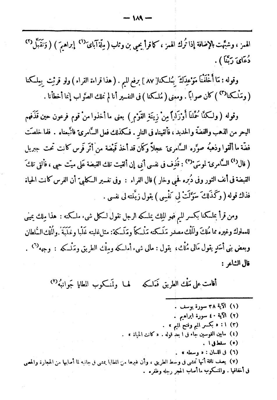 ومن قرأ بملكنا بكسر الميم فهو الملك يملكه الرجل تَقُولُ لكل شيء ملكته: هَذَا ملك يميني للمملوك وغيره مما مُلك والملك مصدر ملكته مَلْكًا ومَلَكة: مثل غلبته غَلْبًا وغَلَبَةً. والملك السلطان وبعض بني أسد يقول مالي مُلْك، يقول: مالي شيء أملكه وملك الطريق ومَلْكه: وجهه «6» .