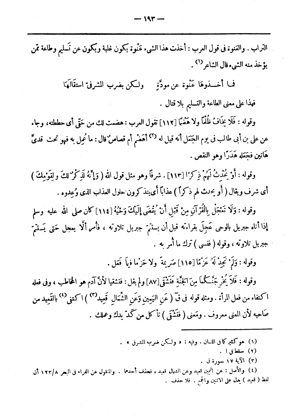 وقوله: فَلا يَخافُ ظُلْماً وَلا هَضْماً [112] تَقُولُ العرب: هضمت لك من حَقّي أي حططته، وجاء عَن عَليّ بن أبي طالب فِي يوم الْجَمَل أَنَّهُ قيل لَهُ «2» أهضم أم قصاصٌ قَالَ: ما عُمِل بِهِ فهو تَحت قديَّ هاتين فجَعَله هَدرًا وهو النقص.