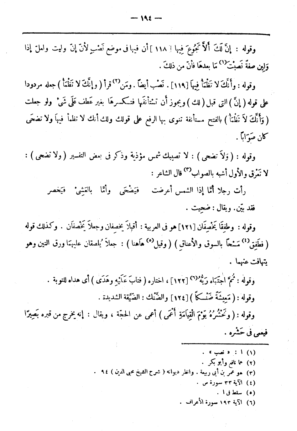 وقوله: وَأَنَّكَ لا تَظْمَؤُا فِيها [119] . نصب أيضًا. ومن «2» قرأ (وَإِنَّكَ لا تَظْمَأُ) جعله مردودًا عَلَى قوله (إنَّ) التي قبل (لك) ويَجوز أن تستأنفها فتكسرها بغير عَطف عَلَى شيء ولو جعلت (وَأَنَّكَ لا تَظْمَأُ) بالفتح مستأنفة تنوي بِهَا الرفع عَلَى قولك ولك أنك لا تظمأ فيها ولا تضحَى كان صوابا.