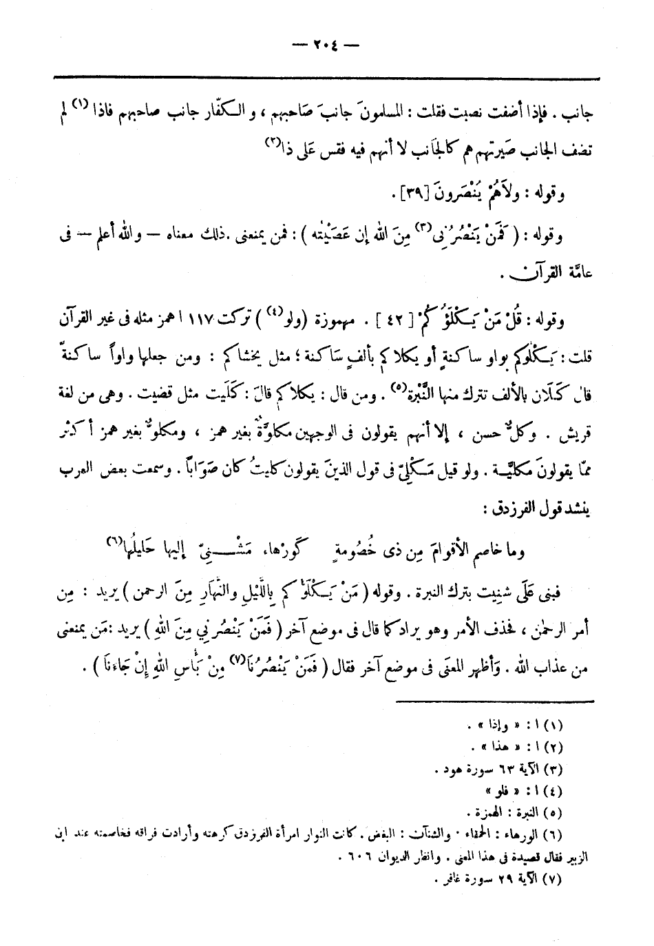 وقوله: قُلْ مَنْ يَكْلَؤُكُمْ [42] . مهموزة (ولو «4» ) تركت 117 اهمز مثله فِي غير القرآن قلت: يكلوكم بواو ساكنة أو يكلاكم بألف ساكنة مثل يَخشاكم: ومن جعلها وَاوًا ساكنة قَالَ كَلان بالألف تترك منها النبرة «5» . ومن قَالَ: يكلاكم قَالَ: كليت مثل قضيت. وهي من لغة قريش. وكلٌّ حسن، إلا أنهم يقولون فِي الوجهين مكلوَّةٌ بغير همز، ومكلوٌّ بغير همز أكثر مما يقولون مكليَّة. ولو قيل مَكْلِيّ فِي قول الَّذِينَ يقولون كليتُ كَانَ صوابًا. وسمعتُ بعض العرب ينشد قول الفرزدق: