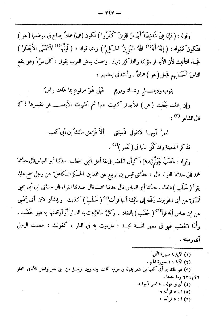وقوله: حَصَبُ جَهَنَّمَ [98] ذُكر أن الحصب فِي لغة أهل اليمن الحطب. حَدَّثَنَا أَبُو الْعَبَّاسِ قَالَ حَدَّثَنَا مُحَمَّدٌ قَالَ حَدَّثَنَا الْفَرَّاءُ قَالَ: حَدَّثَنِي قيس بن الرَّبِيعِ عَنْ مُحَمَّدِ بْنِ الْحَكَمِ الْكَاهِلِيِّ عَنْ رَجُلٍ سَمِعَ عَلِيًّا يَقْرَأُ (حَطَبُ) بِالطَّاءِ. حَدَّثَنَا أَبُو الْعَبَّاسِ قَالَ حَدَّثَنَا مُحَمَّدٌ قَالَ حَدَّثَنَا الْفَرَّاءُ قَالَ حَدَّثَنِي ابْنُ أَبِي يَحْيَى الْمَدَنِيُّ عَنْ أَبِي الْحُوَيْرِثِ رَفَعَهُ إِلَى عَائِشَةَ أَنَّهَا قَرَأَتْ «5» (حَطَبُ) كَذَلِكَ. وبإسنادٍ لابن أبي يَحْيَى عَن ابن عباس أَنَّهُ قرأ «6» (حَضَب) بالضاد. وكلُّ ما هيَّجت بِهِ النار أو أوقدتها بِهِ فهو حَضَب.