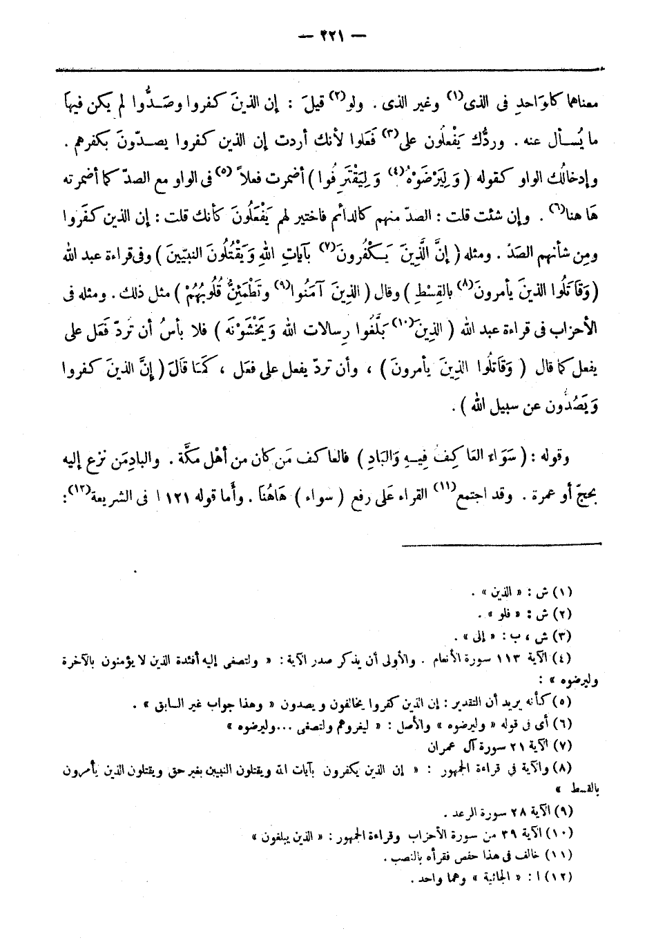 وإدخالك الواو كقوله (وَلِيَرْضَوْهُ «4» وَلِيَقْتَرِفُوا) أضمرت فعلًا «5» فِي الواو مع الصدّ كما أضمرته هاهنا «6» . وإن شئت قلت: الصد منهم كالدائم فاختيرَ لَهُم يفعلونَ كأنك قلت: إن الَّذِينَ كفروا ومن شأنهم الصد. ومثله (إِنَّ الَّذِينَ يَكْفُرُونَ «7» بِآياتِ اللَّهِ وَيَقْتُلُونَ النَّبِيِّينَ) وَفِي قراءة عبد الله (وقاتَلوا الَّذِينَ يأمرون «8» بالقسط) وقال (الَّذِينَ آمَنُوا «9» وَتَطْمَئِنُّ قُلُوبُهُمْ) مثل ذَلِكَ. ومثله فِي الأحزاب فِي قراءة عبد الله (الَّذِينَ «10» بَلَّغُوا رِسَالات اللهِ ويَخْشَوْنَهُ) فلا بأس أن تردّ فَعَل عَلَى يفعل كما قَالَ (وَقَاتلُوا الَّذِينَ يأمرونَ) ، وأن ترد يفعل عَلَى فعل، كما قَالَ (إِنَّ الَّذِينَ كَفَرُوا وَيَصُدُّونَ عَنْ سَبِيلِ اللَّهِ) .