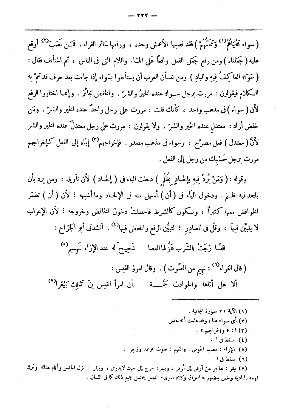 (سَواءً الْعاكِفُ فِيهِ وَالْبادِ) ومن شأن العرب أن يستأنفوا بسواء إذا جاءت بعد حرف قد تم بِهِ الكلام فيقولون: مررت برجلٍ سواء عنده الخير والشر. والخفض جائز. وإنما اختاروا الرفعَ لأن (سَواءً) فِي مذهب واحد، كأنك قلت: مررت عَلَى رجل واحد عنده الخير والشر. ومن خفض أراد: معتدل عنده الخير الشرّ. ولا يقولون: مررت عَلَى رجل معتدلٌ عنده الخير والشر لأن (معتدل) فعل مصرَّح، وسواء فِي مذهب مصدر. فإخراجهم «3» إيّاه إلى الفعل كإخراجهم مررت برجلٍ حَسْبِك من رجل إلى الفعل.