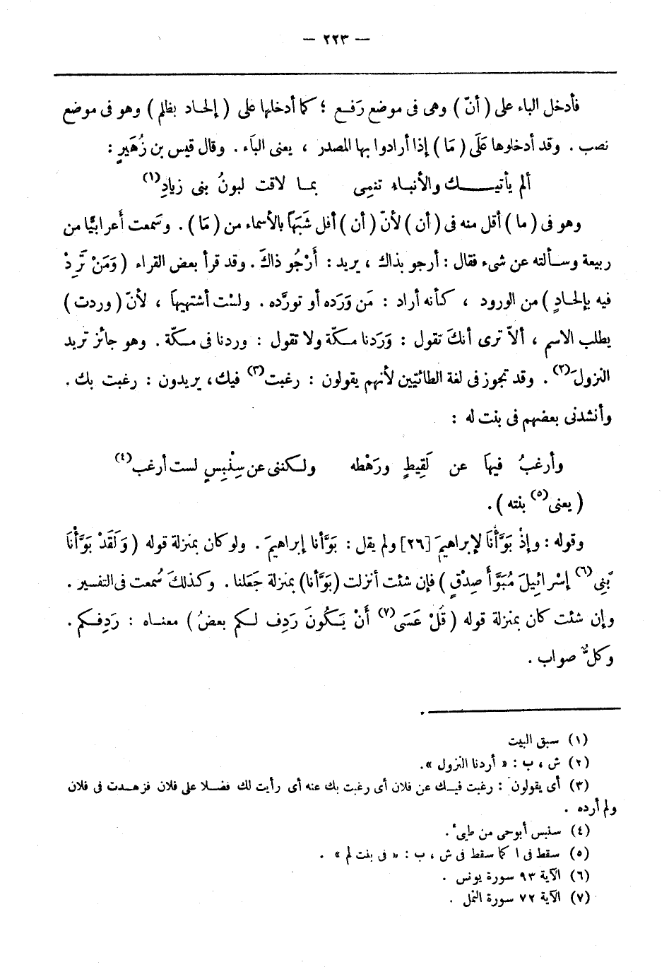 وهو فِي (ما) أقل منه فِي (أن) لأنّ (أن) أفل شَبَهًا بالأسماء من (ما) . وسمعتُ أعرابيًا من ربيعة وسألته عَن شيء فقال: أرجو بذاك، يريد: أرْجُو ذاكَ. وقد قرأ بعضُ القراء (وَمَن تَرِدْ فِيهِ بإلحادٍ) من الورود، كأنه أراد: مَن وَرَده أو تورَّده. ولست أشتهيهَا، لأن (وردت) يطلب الاسم، ألا ترى أنك تَقُولُ: ورَدنا مكة ولا تَقُولُ: وردنا فِي مكة. وهو جائز تريد النزول «2» . وقد تَجوز فِي لغة الطائيين لأنهم يقولون: رغبت «3» فيك، يريدون: رغبت بك.