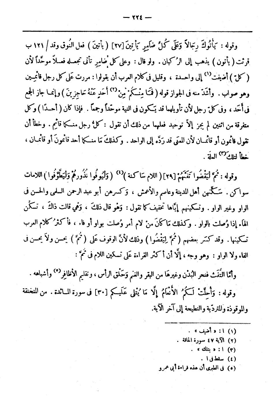 وقوله: ثُمَّ لْيَقْضُوا تَفَثَهُمْ [29] (اللام ساكنة) «4» (وَلْيُوفُوا نُذُورَهُمْ وَلْيَطَّوَّفُوا) اللامات سواكن. سَكَّنهن أهل المدينة وَعَاصِم والأعمش، وكسرهن أبو عبد الرحمن السلمى والحسن فِي الواو وغير الواو. وتسكينهم إيّاها تخفيف كما تَقُولُ: وهو قَالَ ذَلِكَ، وهي قالت ذاك، تسكن الْهَاء إذا وصلت بالواو. وكذلك ما كَانَ من لام أمر وصلت بواو أو فاء، فأكثر كلام العرب تسكينها. وقد كسر بعضهم (ثُمَّ لْيَقْضُوا) وَذَلِكَ لأن الوقوف عَلَى (ثُمَّ) يحسن ولا يحسن فِي الفاء ولا الواو: وهو وجه، إلا أن أكثر القراءة عَلَى تسكين اللام فِي ثُمَّ: