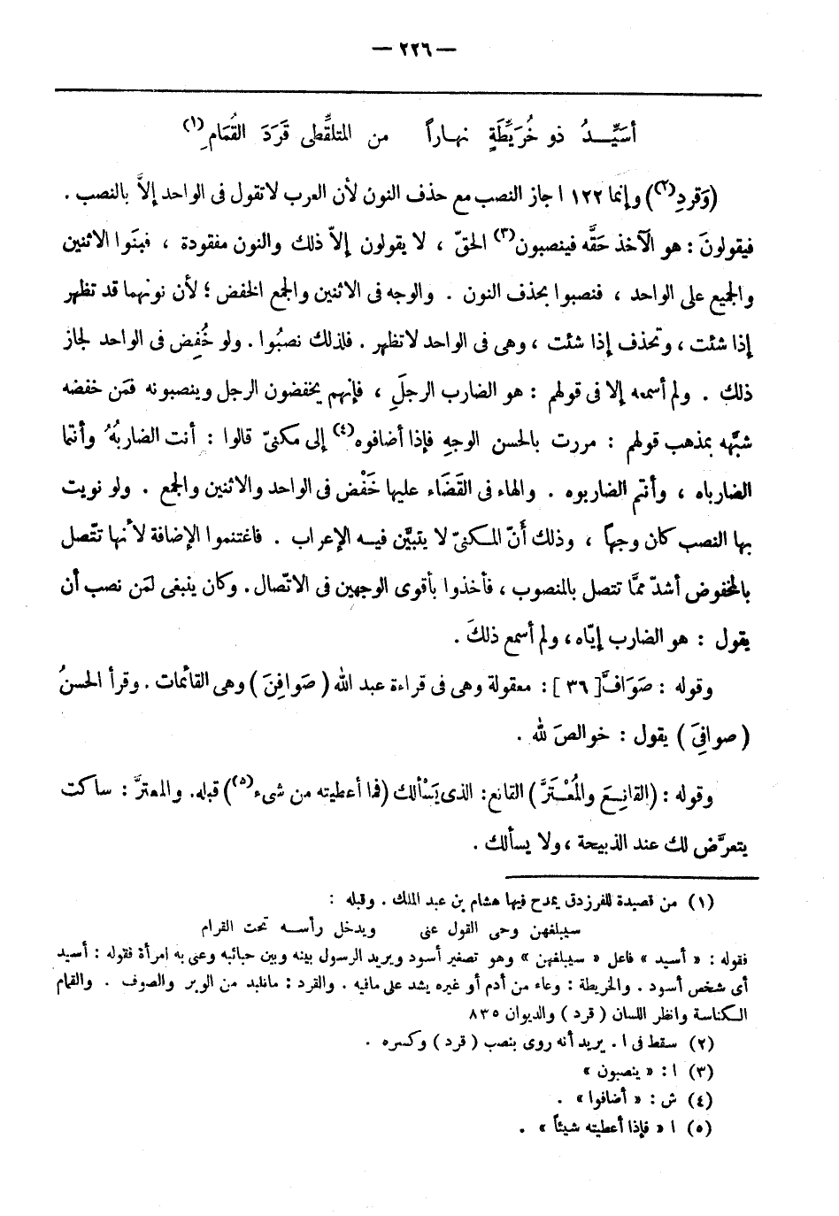(وقرد «2» ) وإنما 122 اجاز النصب مع حذف النون لأن العرب لا تَقُولُ فِي الواحد إلا بالنصب.