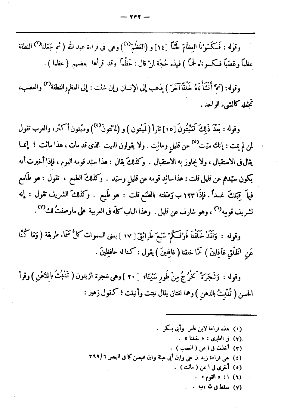 وقوله: بَعْدَ ذلِكَ لَمَيِّتُونَ [15] تقرأ (لَمَيِّتُونَ) و (لمائتون «4» ) وميّتون أكثر، والعرب تَقُولُ لمن لم يَمت: إنك ميّت «5» عَن قليل ومائت. ولا يقولونَ للميت الَّذِي قد مات، هَذَا مائت إنما يقال فِي الاستقبال، ولا يجاوز بِهِ الاستقبال. وكذلك يُقال: هَذَا سيد قومه اليوم، فإذا أخبرت أَنَّهُ يكون سيدهم عَن قليل قلت: هَذَا سائد قومه عَن قليل وسيد. وكذلك الطمع، تَقُولُ: هُوَ طامع فيما قِبلك غدًا. فإذا 123 ب وصفته بالطمع قلت: هُوَ طمع. وكذلك الشريف تقول: إنه لشريف قومه «6» ، وهو شارف عن قليل. وهذا الباب كله فِي العربية عَلَى ما وصفت لك «7» .