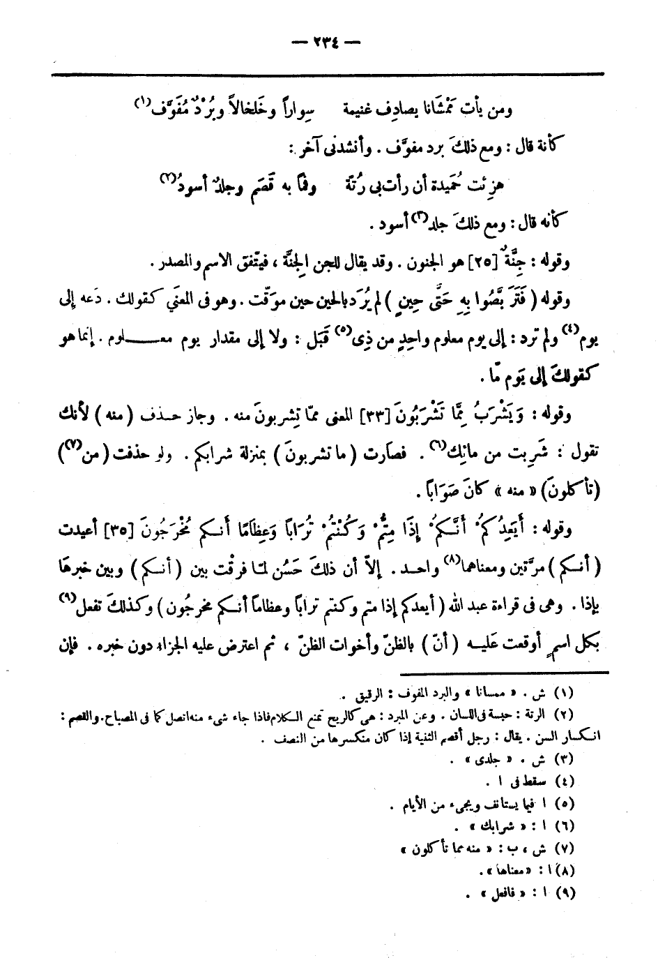 وقوله: وَيَشْرَبُ مِمَّا تَشْرَبُونَ [33] المعنى مما تشربون منه. وجاز حذف (منه) لأنك تَقُولُ: شربت من مائك «6» . فصارت (ما تشربون) بمنزلة شرابكم. ولو حذفت (من «7» ) (تأكلون) «منه» كَانَ صوابًا.