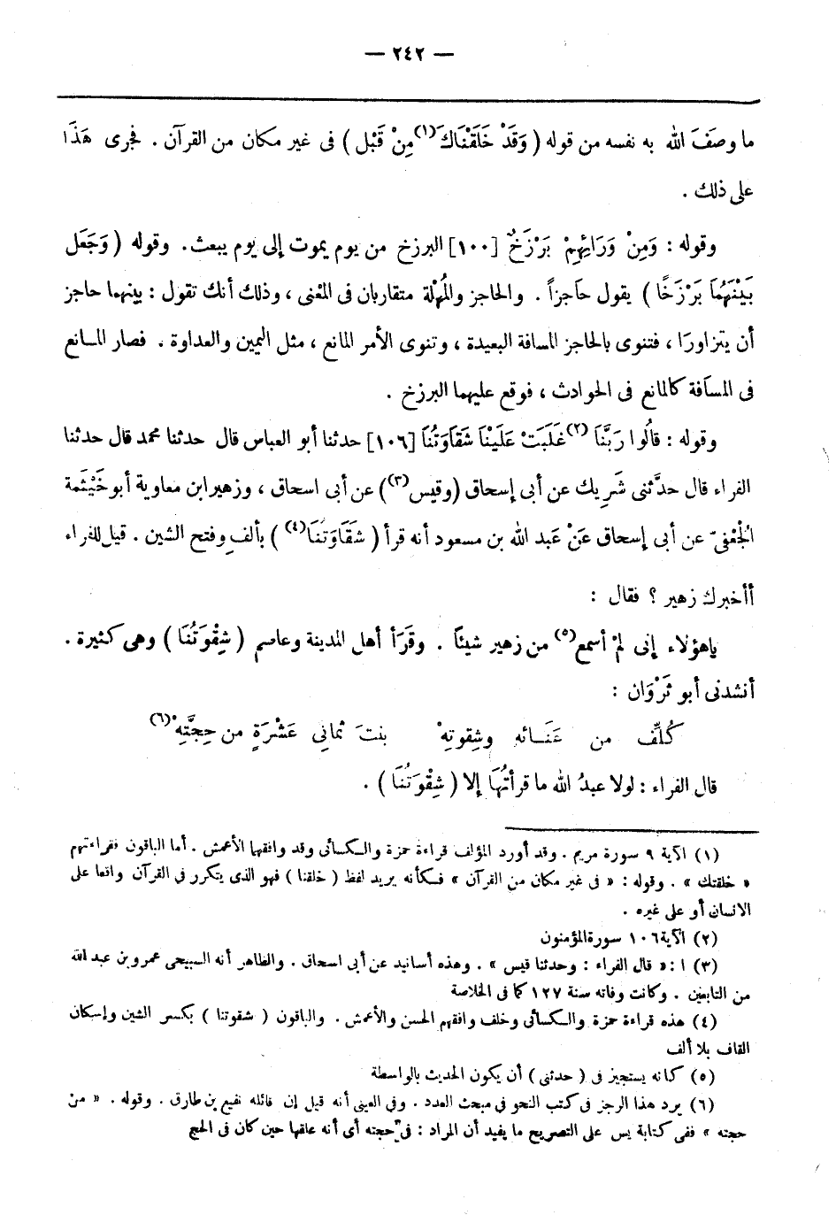 وقوله: قالُوا رَبَّنا «2» غَلَبَتْ عَلَيْنا شقاوتُنا [106] حَدَّثَنَا أَبُو الْعَبَّاسِ قَالَ حَدَّثَنَا مُحَمَّدٌ قَالَ حَدَّثَنَا الْفَرَّاءُ قَالَ حَدَّثَنِي شَرِيكٌ عَنْ أَبِي إِسْحَاقَ (وَقَيْسٌ «3» ) عن أبى إسحاق، وزهير ابن مُعَاوِيَةَ أَبُو خَيْثَمَةَ الْجُعْفِيُّ عَنْ أَبِي إِسْحَاقَ عَنْ عَبْدِ اللَّهِ بْنِ مَسْعُودٍ أَنَّهُ قَرَأَ (شَقَاوَتِنَا «4» ) بِأَلِفٍ وَفَتْحِ الشِّينِ. قيل للفراء أأخبرك زهير؟ فقال:
