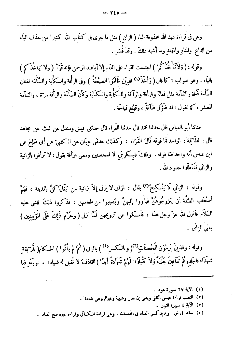 حَدَّثَنَا أَبُو الْعَبَّاسِ قَالَ حَدَّثَنَا مُحَمَّدٌ قَالَ حَدَّثَنَا الْفَرَّاءُ قَالَ حَدَّثَنِي قَيْسٌ وَمِنْدَلٌ عَنْ لَيْثٍ عَنْ مُجَاهِدٍ قَالَ: الطَّائِفَةُ: الْوَاحِدُ فَمَا فَوْقَهُ قَالَ الْفَرَّاءُ: وَكَذَلِكَ حَدَّثَنِي حِبَّانُ عَنِ الْكَلْبِيِّ عَنْ أَبِي صَالِحٍ عَنِ ابْنِ عَبَّاسٍ أَنَّهُ وَاحِدٌ فَمَا فَوْقَهُ. وَذَلِكَ للبكرين لا للمحصنين ومعنى الرأفة يقول: لا ترأفوا بالزانية والزاني فتعطلوا حدود الله.