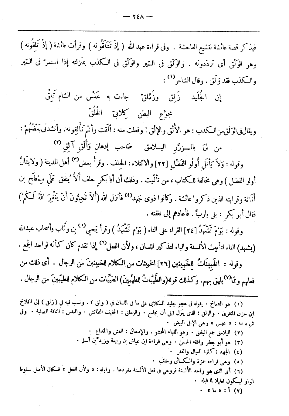 فيذكر قصة عائشة لتشيع الفاحشة. وَفِي قراءة عبد الله (إذ تَتَلَقَّوْنه) وقرأت عائشة (إِذْ تَلَقَّوْنَهُ) وهو الْوَلْق أي تردّدونه. والوَلْق فِي السير والوَلْق فِي الكذب بِمنزلته إِذَا استمر فِي السير والكذب فقد وَلَق. وقال الشاعر «1» :