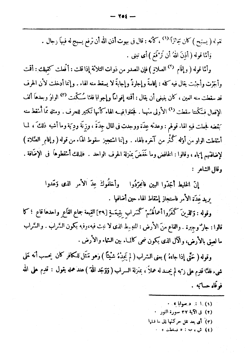 وقوله: وَالَّذِينَ كَفَرُوا أَعْمالُهُمْ كَسَرابٍ بِقِيعَةٍ [39] القيعة جِماع القاع واحدها قاع كما قالوا: جارٌ وجيرة. والقاعُ من الأرض: المنبسط الَّذِي لا نبت فِيهِ، وَفِيهِ يكون السراب. والسراب ما لصق بالأرض، والآل الَّذِي يكون ضحى كالماء بين السماء والأرض.