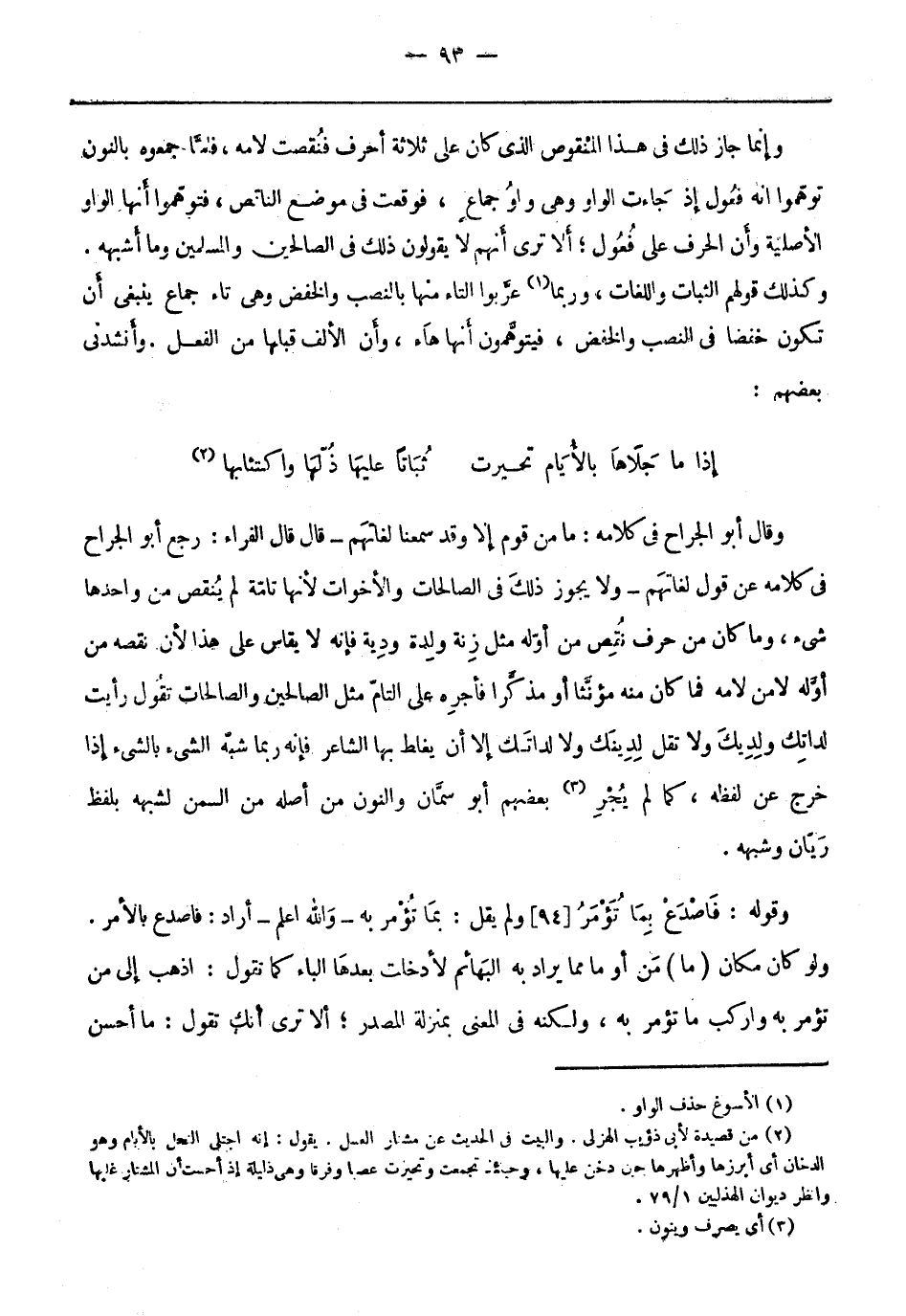 وقال أَبُو الجراح فِي كلامه: ما من قوم إلا وقد سمعنا لغاتهم- قَالَ قَالَ الفراء: رجع أَبُو الجراح فِي كلامه عَن قول لغاتَهم- ولا يَجوز ذَلِكَ فِي الصالِحات والأخوات لأنّها تامة لَمْ يُنقص من واحدها شيء، وما كَانَ من حرف نُقص من أوّله مثل زِنة ولدة ودِيَة فإنه لا يُقاس عَلَى هَذَا لأن نقصه من أوَّله لا من لامه فما كَانَ منه مؤنثًا أو مُذكرًا فأجرهِ عَلَى التامّ مثل الصالِحين والصالِحات تقولُ رأيت لداتِك ولِدِيكَ ولا تقل لِدِينَك ولا لداتَك إلا أن يغلط بِهَا الشاعر فإنه ربَّما شبّه الشيء بالشيء إذا خرج عَن لفظه، كما لَمْ يُجْرِ «3» بعضهم أَبُو سمَّان والنون من أصله من السمن لشبهه بلفظ رَيّان وشبهه.
