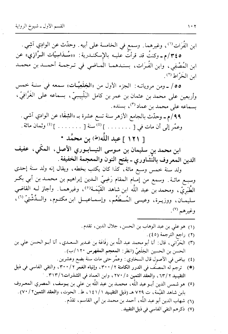 [121] عبد الله (ط) بن محمد ابن محمد بن سليمان بن موسى النيسابوري الأصل المكي عفيف الدين المعروف بالنشاوري -بفتح النون والمعجمة الخفيفة.