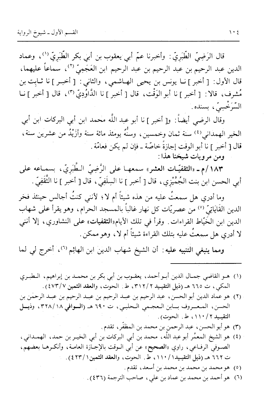 قال الرضي الطبري: وأخبرنا عم أبي يعقوب بن أبي بكر الطبري وعماد الدين عبد الرحيم بن عبد الرحيم بن عبد الرحيم ابن العجمي سماعاً عليهما قال الأول: [أخبر] نا يونس بن يحيى الهاشمي والثاني: [أخبر] نا ثابت بن مُشرف قالا [أخبر] نا أبو الوقت قال [أخبر] نا الداودي قال [أخبر] نا السرخسي بسنده. وقال الرضي أيضاً: و [أخبر] نا أبو عبد الله محمد بن أبي البركات ابن أبي الخير الهمداني سنة ثمان وخمسين وسنة يومئذ مائة سنة وأزيج من عشرين سنة قال [أخبر] نا أبو الوقت إجازة خاصة -فإن لم يكن فعامة. ومن مرويات شيخنا هذا: 183/م- "االثقفيات العشر" سمعها على الرضي الطبري بسماعه على أبي الحسن ابن بنت الجُميزي قال [أخبر] نا السلفي قال [أخبر] نا الثقفي. وما أدري هل سمعت عليه من هذه شيئاً أم لا لأنني كنت أجالس حينئذ فخر الدين القاياتي من عصريات كل نهار غالباً بالمسجد الحرام وهو يقرأ على شهاب الدين ابن الخياط القراءات. وقرأ فى تلك الأيام "الثقفيات" على الناشوري إلا أنني لا أدري هل سمعت عليه بتلك القراءة شيئاً أم لا وهو ممكن. ومما ينبغي التنبيه عليه: أن الشيخ شهاب الدين ابن الهائم أخرج لي لما