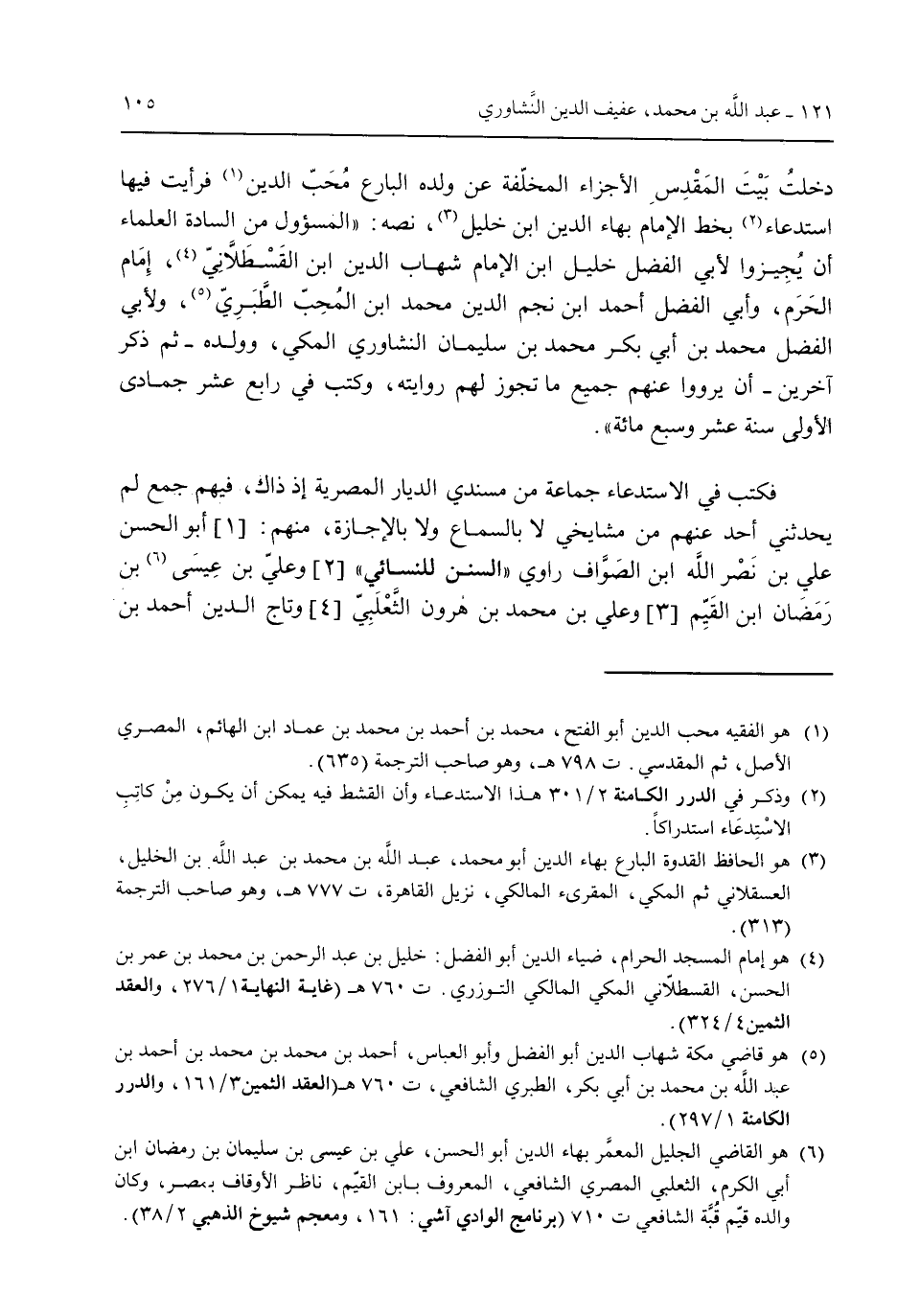 دخلتُ بيت المقدس الأجزاء المخلفة عن ولده البارع محب الدين فرأيت فيها استدعاء بخط الإمام بهاء الدين ابن خليل نصه: "المسؤول من السادة العلماء أن يُجيزوا لأبي الفضل خليل بن الإمام شهاب الدين ابن القسطلاني إمام الحرم وأبي الفضل أحمد ابن نجم الدين محمد ابن المُحب الطبري ولأبي الفضل محمد بن أبي بكر محمد بن سليمان النشاوري المكي وولده -ثم ذكر آخرين- أن يرووا عنهم جميع ما تجوز لهم روايته وكتب فى رابع عشر جمادى الأولى سنة عشر وسبع مائة".فكتب فى الاستدعاء جماعة من مسندي الديار المصرية أذ ذاك فيهم جمع لم يحدثني أحد عنهم من مشايخي لا بالسماع ولا بالإجازة منهم: أبو الحسم علي بن نصر الله ابن الصواف راوي "السنن للنسائي" وعلي بن عيسى بن أحمد بن رمضان ابن القيم وعلي بن محمد بن هارون الثعلبي وتاج الدين أحمد بن