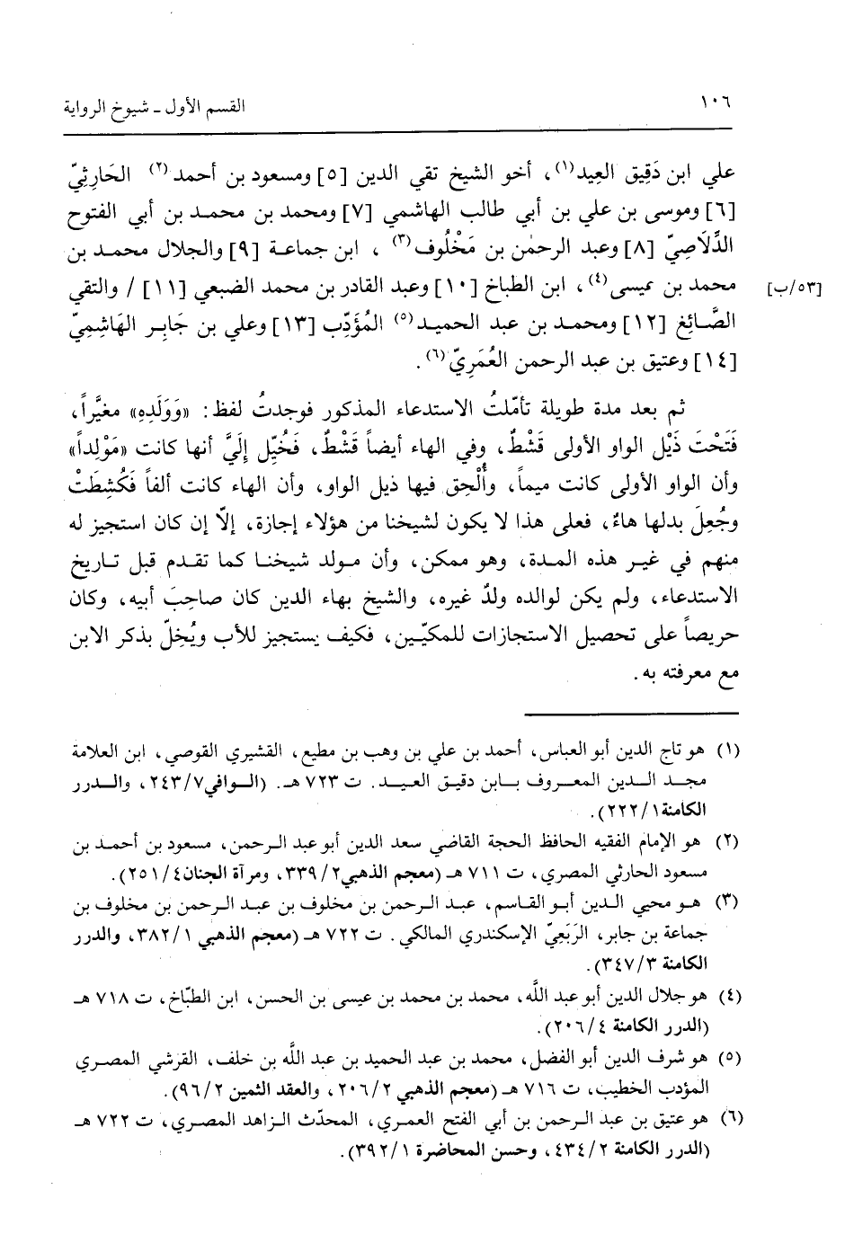 علي ابن دقيق العيد أخو الشيخ تقي الدين ومسعود بن أحمد الحارثي وموسى بن علي بن أبي طالب الهاشمي ومحمد بن محمد بن أبي الفتوح الدلاصي وعبد الرحمن بن مخلوف ابن جماعة والجلال محمد بن محمد بن عيسى ابن الطباخ وعبد القادر بن محمد الضبعي والتقي الصائغ ومحمد بن عبد الحميد المؤدب وعلي بن جابر الهاشمي وعتيق بن عبد الرحمن العُمري. ثم بعد مدة طويلة تأملت الاستدعاء المذكور فوجدت لفظ: "وولده" مغيراً فتحت ذيل الواو الأولى قشط وفى الهاء أيضاً قشط فَخُيل إلي أنها كانت "مولداً" وأن الواو الأولى كانت ميماً وأُلحق فيها ذيل الواو وأن الهاء كانت ألفاً فكشطت وجُعل بدلها هاء فعلى هذا لا يكون لشيخنا من هؤلاء إجازة إلا إن كان استجيز له منهم فى غير هذه المدة وهو ممكن وأن مولد شيخنا كما تقدم قبل تاريخ الاستدعاء ولم يكن لوالده ولد غيره والشيخ بهاء الدين كان صاحب أبيه وكان حريصاً على تحصيل الاستجازات للمكيين فكيف يستجيز للأب ويُخل بذكر الابن مع معرفته به.