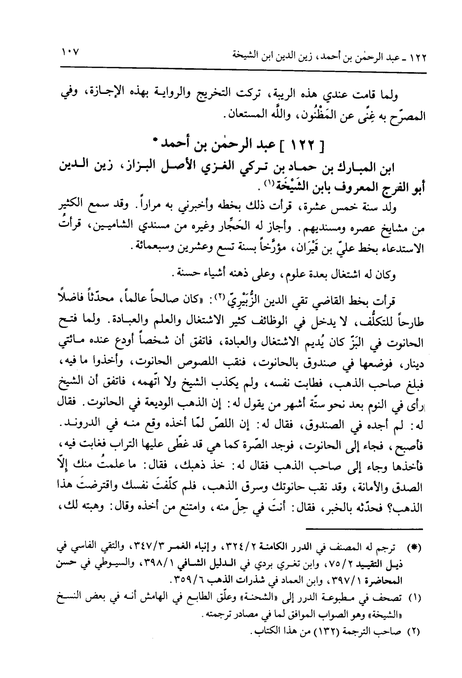 [122] عبد الرحمن بن أحمدابن المبارك بن حماد بن تركي الغزي الأصل البزاز زين الدين أبو الفرج المعروف باين الشيخة.