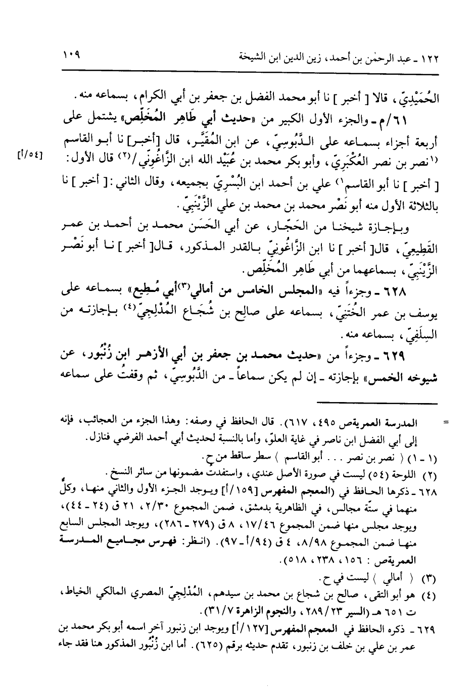 الحُميدي قالا [أخبر] نا أبو محمد الفضل بن جعفر بن أبي الكرام بسماعه منه.61/م- والجزء الأول الكبير من "حديث أبي طاهر المُخلص" يشتمل على أربعة أجزاء بسماعه على الدبوسي عن ابن المُقير قال [أخبر] نا أبو القاسم نصر بن نصر العُكبري وأبو بكر محمد بن عبيد الله ابن الزاغوني قال الأول: [أخبر] نا أبو القاسم علي بن محمد بن علي الزينبي. وبإجازة شيحنا من الحجار عن أبي الحسن محمد بن أحمد بن عمر القطيعي قال [أخبر] نا ابن الزاغوني بالقدر المذكور قال [أخبر] نا أبو نصر الزينبي بسماعهما من أبي طاهر المُخلص.628 - وجزءاً فيه " المجلس الخامس من أمالي أبي مطيع" بسماعه على يوسف بن عمر الخُتني بسماعه على صالح بن شجاع المُدلجي بإجازته من السلفي بسماعه منه.629 - وجزءاً من "حديث محمد بن جعفر بن أبي الأزهر ابن زُنبور عن شيوخه الخمس" بإجازته -إن لم يكن سماعاً- من الدُبوسي ثم وقفت على سماعه