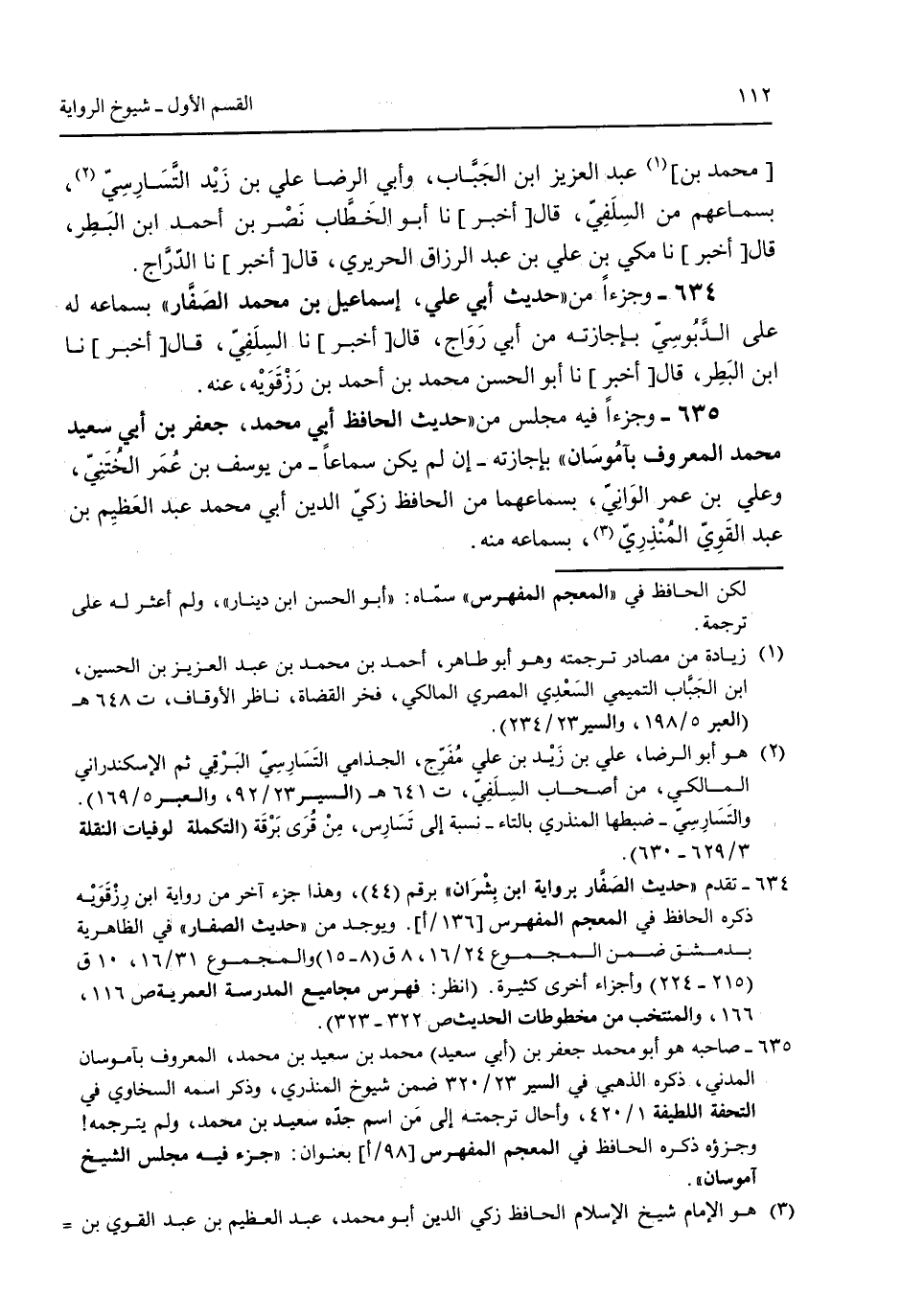محمد بن عبد العزيز ابن الجباب وأبي الرضا علي بن زيد التسارسي بسماعهم من السلفي قال [أخبر] نا أبو الخطاب نصر بن أحمد بن البطر قال [أخبر] نا مكي بن علي بن عبد الرازق الحريري قال [أخبر] نا الدراج. 634 - وجزءاً من "حديث أبي علي إسماعيل بن محمد الصفار" بسماعه له على الدبوسي بإجازته من أبي رواج قال [أخبر] نا السلفي قال [أخبر] نا ابن البطر قال [أخبر] نا أبو الحسن محمد بن أحمد بن زرقويه عنه. 635 - وجزءاً فيه مجلس من "حديث الحافظ أبي محمد جعفر بن أبي سعيد محمد المعروف بآموسان" بإجازته -إن لم يكن سماعاً- من يوسف بن عُمر الختني وعلي بن عمر الواني بسماعهما من الحافظ زكي الدين أبي محمد عبد العظيم بن عبد القوي المُنذري بسماعه منه.