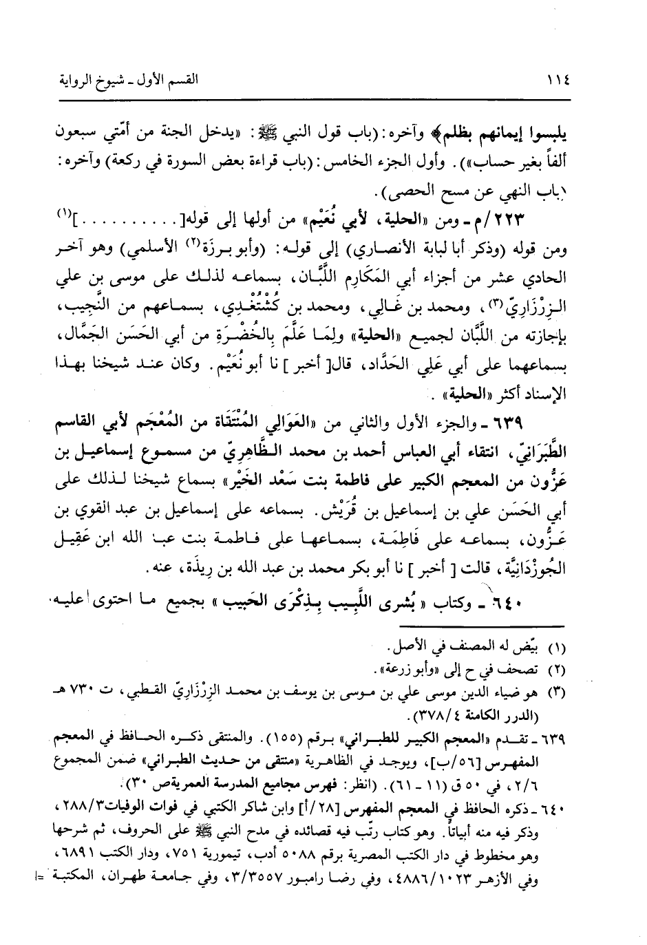 يلبسوا إيمانهم بظلم} وآخره: (باب قول النبى صلى الله عليه وسلم: "يدخل الجنة من امتي سبعون ألفاً بغير حساب"). وأول الجزء الخامس: (باب قراءة بعض السورة فى ركعة) وآخره: (باب النهي عن مسح الحصى).223/م- ومن "الحلية لأبي نعيم" من أولها إلى قوله ( ..... ) ومن قوله (وذكر أبا لبابه الأنصاري) إلى قوله: (وأبو برزة الأسلمي) وهو آخر الحادي عشر من أجزاء أبي المكارم اللبان بسماعه لذلك على موسى بن علي الزرزاري ومحمد بن غالي ومحمد بن كُشتغدي بسماعهم من النجيب بإجازته من اللبان لجميع "الحلية" ولما علم بالخضرة من أبي الحسن الجمال بسماعهما على أبي علي الحداد قال [أخبر] نا أبو نعيم. وكان عند شيخنا بهذا الإسناد أكثر "الحلية" 639 - والجزء الأول والثاني من "العوالي المنتقاه من المعجم لأبي القاسم الطبراني انتقاء أبي العباس أحمد بن محمد الظاهري من مسموع بن إسماعيل بن عزون من المعجم الكبير على فاطمة بنت سعد الخير" بسماع شيخنا لذلك على أبي الحسن علي بن إسماعيل بن قريش. بسماعه على إسماعيل بن عبد القوي بن عزون بسماعه على فاطمة بسماعها على فاطمة بنت عبد الله ابن عقيل الجوزدانية قالت [أخبر] نا أبو بكر محمد بن عبد الله بن ريدة عنه. 640 - وكتاب "بُشرى اللبيب بذكرى الحبيب" بجميع ما احتوى عليه