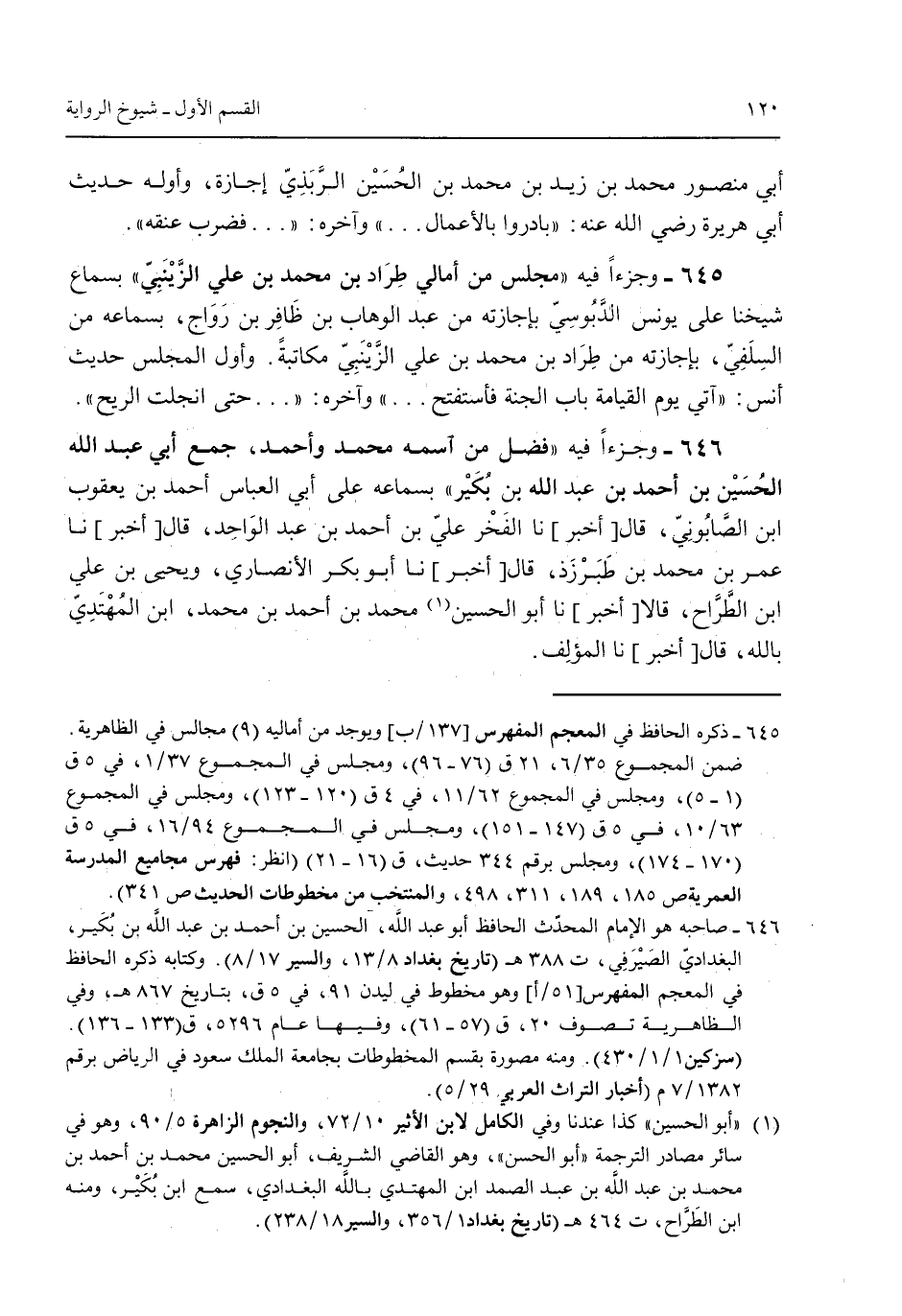 أبي منصور محمد بن زيد بن محمد الحسين الرَّبَذِي إجازة وأوله حديث أبي هريرة رضي الله عنه: "بادروا بالأعمال ... " وآخره: " ... فضرب عنقه". 645 - وجزءاً فيه "مجلس من أمالي طراد بن محمد بن علي الزينبي" بسماع شيخنا على يونس الدبوسي بإجازته من عبد الوهاب بن ظاهر بن رواج بسماعه من السلفي بإجازته من طراد بن محمد بن علي الزينبي مكاتبةً. وأول المجلس حديث أنس: "آتي يوم القيامة باب الجنة فسأفتح ... " وآخره: " ... حتى انجلت الريح". 646 - وجزءاً فيه "فضل آسمه محمد وأحمد جمع أبي عبد الله الحسين بن أحمد بن عبد الله بن بكير" بسماعه على أبي العباس أحمد بن يعقوب ابن الصابوني قال [أخبر] نا الفخر علي بن أحمد بن عبد الواحد قال [أخبر] نا عمر بن محمد بن طبرزذ قال [أخبر] نا أبو بكر الأنصاري ويحيى بن علي ابن الطراح قالا [أخبر] نا أبو الحسين محمد بن أحمد بن محمد ابن المُهتدي بالله قال [أخبر] نا المؤلف.