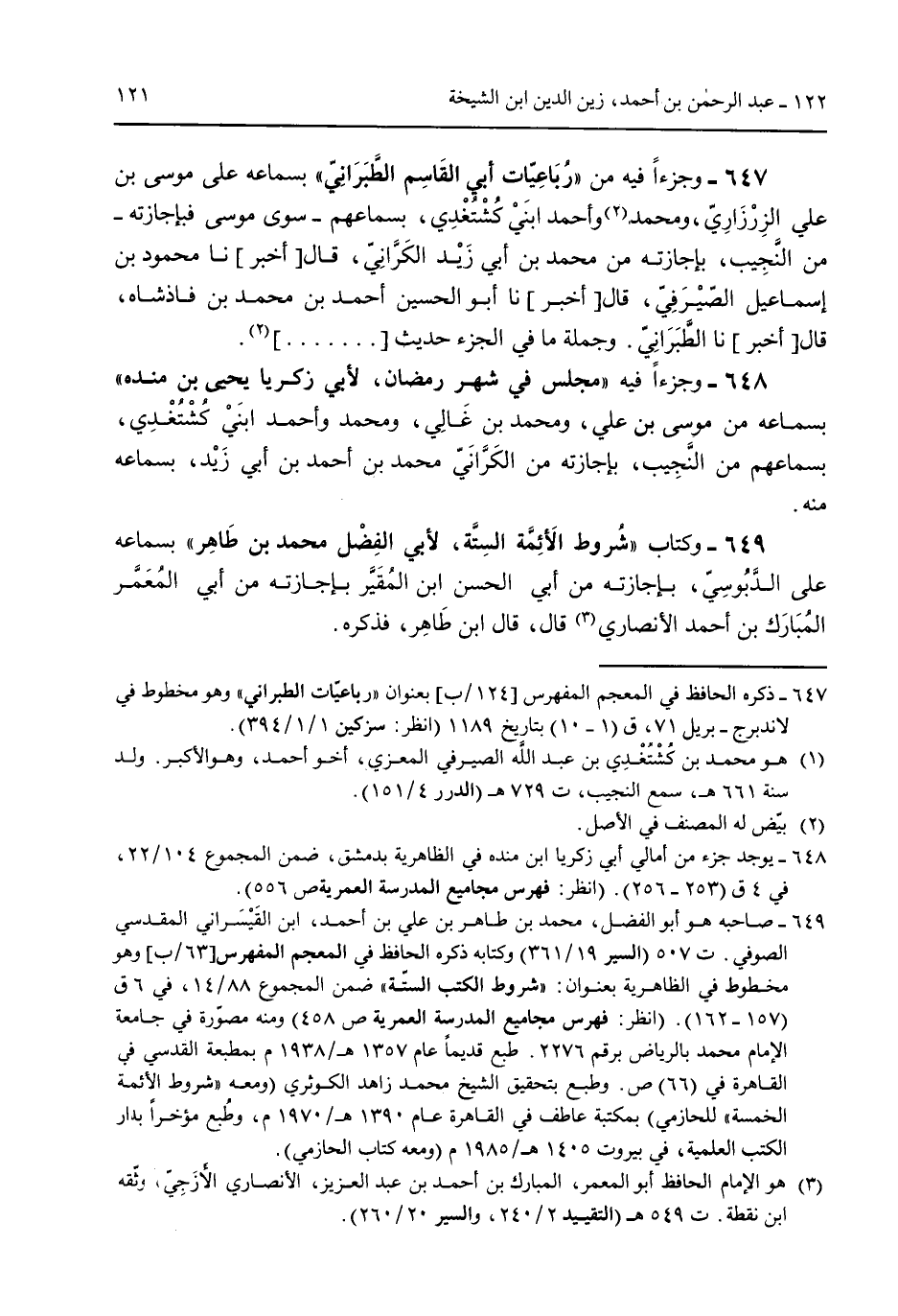 649 - وكتاب "شروط الأئمة السنة لأبي الفضل محمد بن طاهر" بسماعه على الدبوسي بإجازته من أبي الحسن ابن المُقير بإجازته من أبي المُعمر المُبارك بن أحمد الأنصاري قال قال ابن طاهر فذكره.