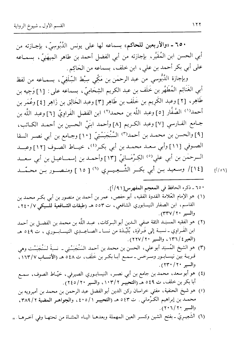 650 - "والأربعين للحاكم" بسماعه لها على يونس الدبوسي بإجازته من أبي الحسن ابن المُقير بإجازته من أبي الفضل أحمد بن طاهر الميهني بسماعه على أبي بكر أحمد بن علي ابن خلف بسماعه من الحاكم. وبإجازة الدبوسي من عبد الرحمن بن مكي سبط السلفي بسماعه من لفظ أبي الغنائم المُطهر بن خلف بن عبد الكريم الشحامي ببسماعه على: وجيه بن طاهر وعبد الكريم بن خلف بن طاهر وعبد الخالق بن زاهر وعمر بن أحمد الصفار وعبد الله بن محمد ابن الفضل الفراوي وعبد الله بن جامع الفارسي وعبد الكريم وأحمد ابني الحسين بن احمد الكاتب الصوفي وأبي سعد محمد بن أبي بكر خياط الصوف وعبد الرحمن بن أبي علي الكرماني وأحمد بن إسماعيل بن أبي سعد وسعيد بن أبي بكر الشعيري ومنصور بن محمد