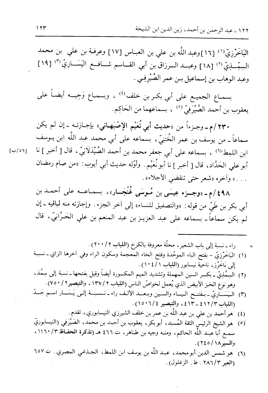 الباخرزي وعبد الله بن علي بن العباس وعرفة بن علي بن محمد السمذي وعبد الرزاق بن أبي القاسم شافع اليساري وعبد الوهاب بن إسماعيل بن عمر الصيرفي. بسماع الجميع على أبي بكر بن خلف وبسماع وجيه أيضاً على يعقوب بن أحمد الصيرفي بسماعهما من الحاكم. 230/م- وجزءاً من "حديث أبي نُعيم الإصبهاني" بإجازته -إن لم يكن سماعاً- من يوسف بن عمر الختني بسماعه على أبي محمد عبد الله ابن يوسف ابن اللمط بسماعه على أبي جعفر محمد بن أحمد الصيدلاني قال [أخبر] نا أبو علي الحداد قال [أخبر] نا أبو نعيم. وأوله حديث أبي أيوب: "من صام رمضان ... " وآخره "شعر حتى تنتقضي الأجلاء".498/م- "وجزء عيسى بن موسى غُنجار" بسماعه على أحمد بن أبي بكر بن طي قوله: "والتصفيق للنساء" إلى أخر الجزء. وإجازته منه لباقيه -إن لم يكن سماعاً- بسماعه على عبد العزيز بن عبد المنعم بن علي الحراني قال