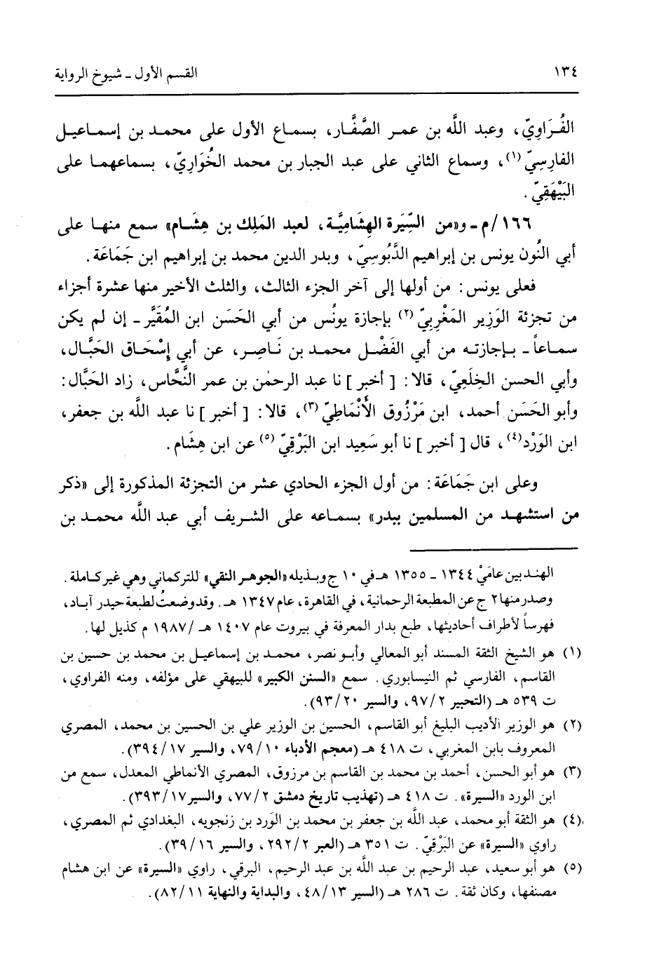 الفراوي، وعبد الله بن عمر الصفار بسماع الأول على محمد بن إسماعيل الفارسي وسماع الثاني على عبد الجبار بن محمد الخواري بسماعهما على البيهقي. 166/م- و"من السيرة الهاشمية لعبد الملك بن هشام" سمع منها على أبي النون يونس بن إبراهيم الدبوسي وبدر الدين محمد بن إبراهيم ابن جماعه.