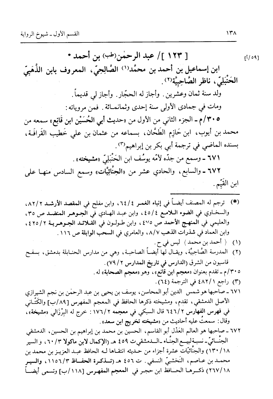 [123] عبد الرحمن (طب) بن أحمد ابن إسماعيل بن أحمد بن محمد الصالحي المعروف بابن الذهبي الحنبلي ناظر الصاحبية.