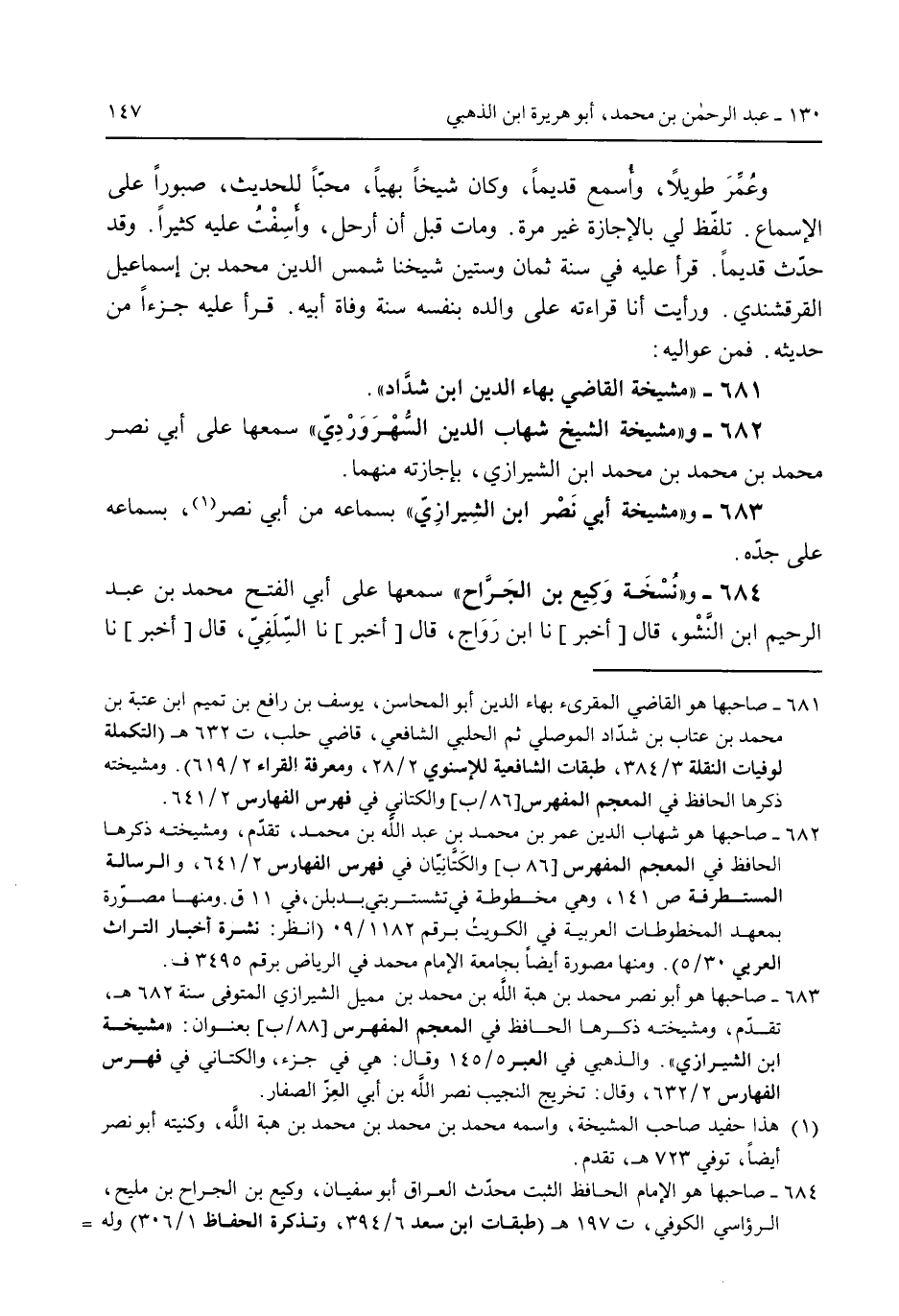 وعَمَّر طويلاً وأسمع قديماً وكان شخاً بهياً محباً للحديث صبوراً على الإسماع. تلفظ لي بالإجازة غير مرة. ومات قبل أن أرحل وأسفت عليه كثيراً. وقد حدث قديماً. قرأ عليه فى سنة ثمان وستين شيخنا شمس الدين محمد بن إسماعيل القرقشندي. ورأيت أنا قراءته على والده بنفسه سنة وفاة أبيه. قرأ عليه جزءاً من حديثه. فمن عواليه: 681 - "مشيخة القاضي بهاء الدين ابن شداد".682 - و "مشيخة الشيخ شهاب الدين السُّهروردي" سمعها على أبي نصر محمد بن محمد بن محمد ابن الشيرازي بإجازته منهما.683 - و"مشيخة أبي نصر ابن الشيرازي" بسماعه من أبي نصر بسماعه على جده.