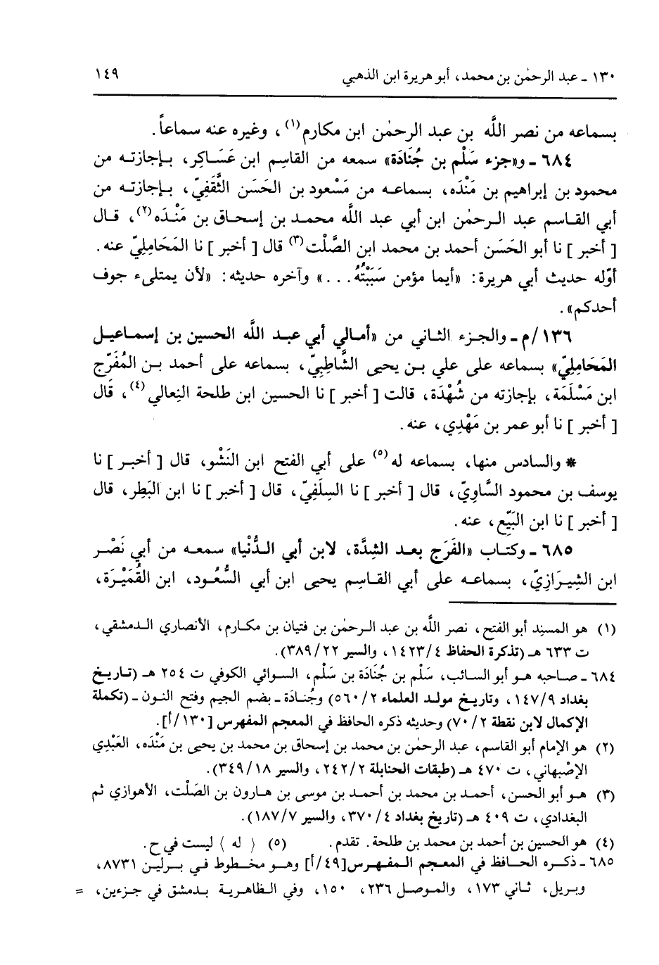 بسماعه من نصر الله بن عبد الرحمن ابن مكارم وغيره عنه سماعاً 684 - و"جزء سلم بن جُنادة" سمعه من القاسم ابن عساكر بإجازته من محمود بن إبراهيم بن منده بسماعه من مسعود بن الحسن الثقفي بإجازته من أبي القاسم عبد الرحمن ابن أبي عبد الله محمد بن إسحاق بن منده قال [أخبر] نا أبو الحسن أحمد بن محمد ابن الصلت قال [أخبر] نا المحاملي عنه. أوله حديث أبي هريرة: "أيما مؤمن سببته ... " وآخره حديثه: ""لأن يمتلئ جوف أحدكم".136/م- والجزء الثاني من "أمالي أبي عبد الله الحسين بن إسماعيل المحاملي" بسماعه على علي بن يحي الشاطبي بسماعه على أحمد بن المُفرج ابن مسلمة بإجازته من شُهدة قالت [أخبر] نا الحسين ابن طلحة النعالي قال [أخبر] نا أبو عمر بن مهدي عنه. والسادس منها بسماعه له على أبي الفتح ابن النشو قال [أخبر] نا يوسف بن محمد الساوي قال [أخبر] نا السلفي قال [أخبر] نا ابن البطر قال [أخبر] نا ابن البيع عنه.685 - وكتاب "الفرج بعد الشدة لابن أبي الدنيا" سمعه من أبي نصر ابن الشيرازي بسماعه على أبي القاسم يحيى ابن أبي السعود ابن القُميرة