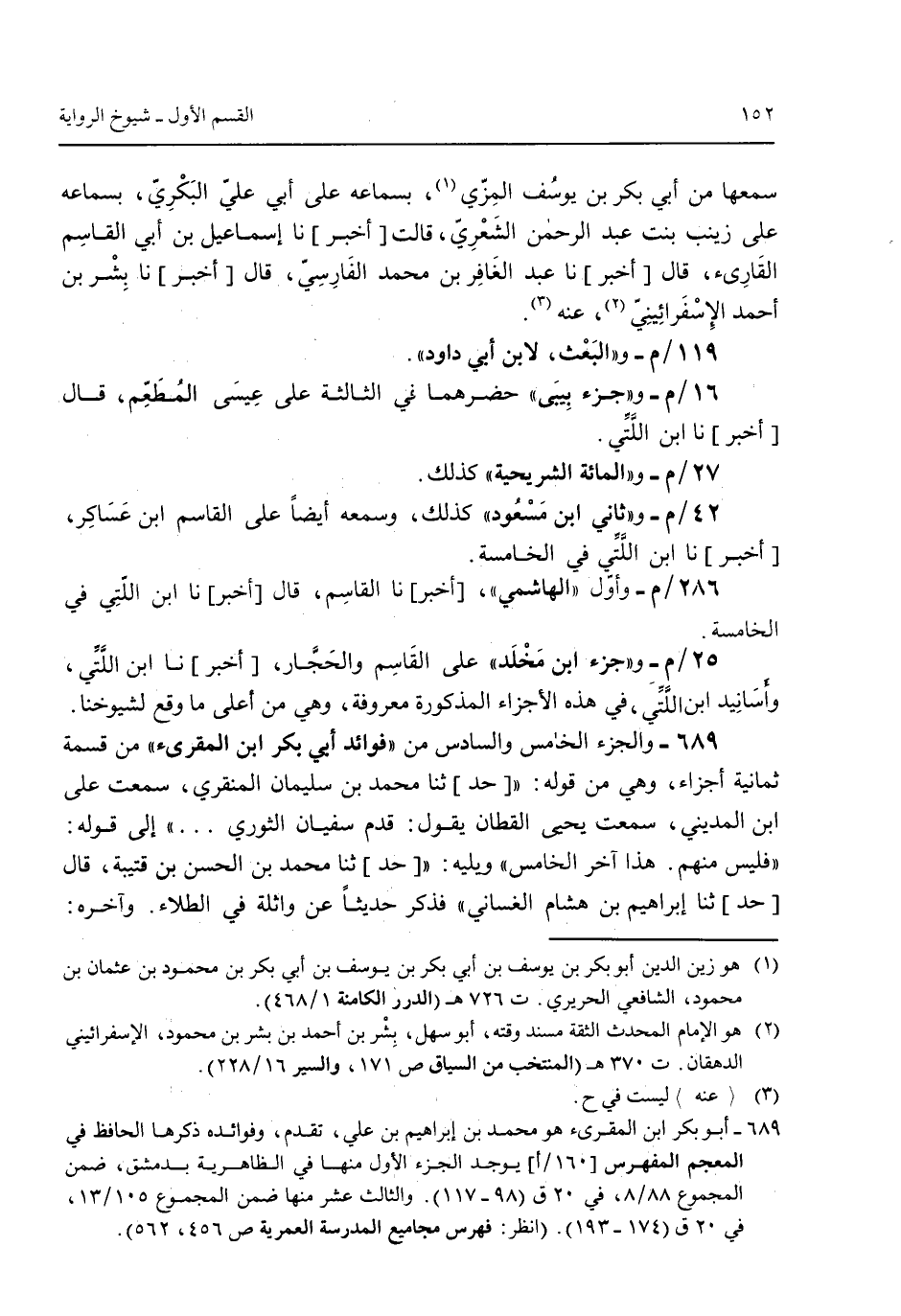 16/م- "وجزء بِيبَى" حضرهما فى الثالثة على عيسى المُطعم قال [أخبر] نا ابن اللتي.27/م- و"المائة التشريحية" كذلك.42/م- و"ثاني ابن مسعود" كذلك وسمعه أيضاً على القاسم ابن عساكر [أخبر] نا ابن اللتي فى الخامسة.286/م- وأول "الهاشمي" [أخبر] نا القاسم قال [أخبر] نا ابن اللتي فى الخامسة.25/م- و"جزء ابن مخلد" على القاسم والحجار [أخبر] نا ابن اللتي وأسانيد ابن اللتي فى هذه الأجزاء المذكورة معروفة وهي من أعلى ما وقع لشيوخنا.689 - والجزء الخامس والسادس من "فوائد أبي بكر ابن المقرئ" من قسمة ثمانية أجزاء وهى من قوله: "حد ثنا محمد بن سليمان المنقري سمعت على ابن المديني سمعت يحي القطان يقول: قدم سفيان الثوري ... " إلى قوله: "فليس منهم. هذا آخر الخامس" ويليه: حدثنا محمد بن الحسن بن قتيبة قال [حد] ثنا إبراهيم بن هشام الغساني" فذكر حديثاً عن واثلة في الطلاء. وآخره: