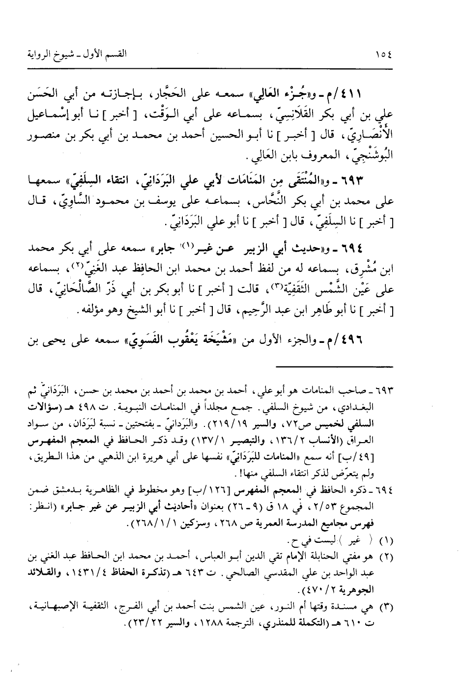 411/م- و "جزء العالي" سمعه على الحجار بإجازته من أبي الحسن علي بن أبي بكر القلانسي بسماعه على أبي الوقت [أخبر] نا أبو إسماعيل الأنصاري قال [أخبر] نا أبو الحسين أحمد بن محمد بن أبي بكر بن منصور البوشنجي المعروف بابن العالي.693 - و"المنتقى من المنامات لأبي علي البرداني انتقاء السلفي" سمعها على محمد بن أبي بكر النحاس بسماعه على يوسف بن محمد الساوي قال [أخبر] نا السلفي قال [أخبر] نا أبو على البرداني.694 - و"حديث أبي الزبير عن غير جابر" سمعه على أبي بكر محمد ابن مُشرق بسماعه له من لفظ أحمد بن محمد ابن الحافظ عبد الغني بسماعه على عين الشمس الثقفية قالت [أخبر] نا أبو بكر بن أبي ذر الصالحاني قال [أخبر] نا أبو طاهر ابن عبد الرحيم قال [أخبر] نا أبو الشيخ وهو مؤلفه.496/م- والجزء الأول من "مشيخة يعقوب الفسوي" سماعه على يحيى بن