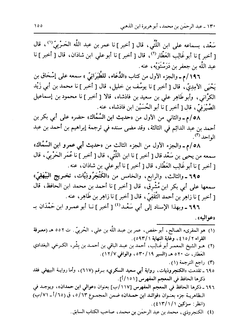 سعد بسماعه على ابن اللتي قال [أخبر] نا عمر بن عبد الله الحربي قال [أخبر] نا أبو غالب العطار قال [أخبر] نا أبو علي شاذان قال [أخبر] نا عبد الله بن جعفر بن درستويه عنه.196/م- والجزء الأول من كتاب الدُعاء للطبراني" سمعه على لإسحاق بن يحيى الآمدي قال [أخبر] نا يوسف بن خليل قال [أخبر] نا محمد بن أبي زيد الكراني وأبو طاهر علي ين سعيد بن فاذشاة قالا [أخبر] نا محمود بن إسماعيل الصيرفي قال [أخبر] نا أبو الحسين ابن فاذشاه عنه.58/م- والثاني من الأول من "حديث ابن السماك" حضره على أبي بكر بن أحمد بن عبد الدائم فى الثالثة وقد مضى سنده فى ترجمة إبراهيم بن أحمد بن عبد الواحد.58/م- والجزء الأول من الجزء الثالث من "حديث أبي عمرو ابن السماك" سمعه من يحيى بن سعد قال [أخبر] نا ابن اللتي قال [أخبر] نا عُمر الحربي قال [أخبر] نا أبو غالب العطار قال [أخبر] نا أبو علي شاذان عنه.695 - والثالث والرابع والخامس من "الكنجروذيات تخريج البيهقي" سمعها على أبي بكر ابن مُشرق قال [أخبر] نا أحمد بن محمد ابن الحافظ قال [أخبر] نا زاهر بن احمد الثقفي قال [أخبر] نا زاهر بن طاهر عنه. 696 - وبهذا الإسناد إلى أبي سعد [أخبر] نا أبو عمرو ابن حمدان بـ "عواليه".