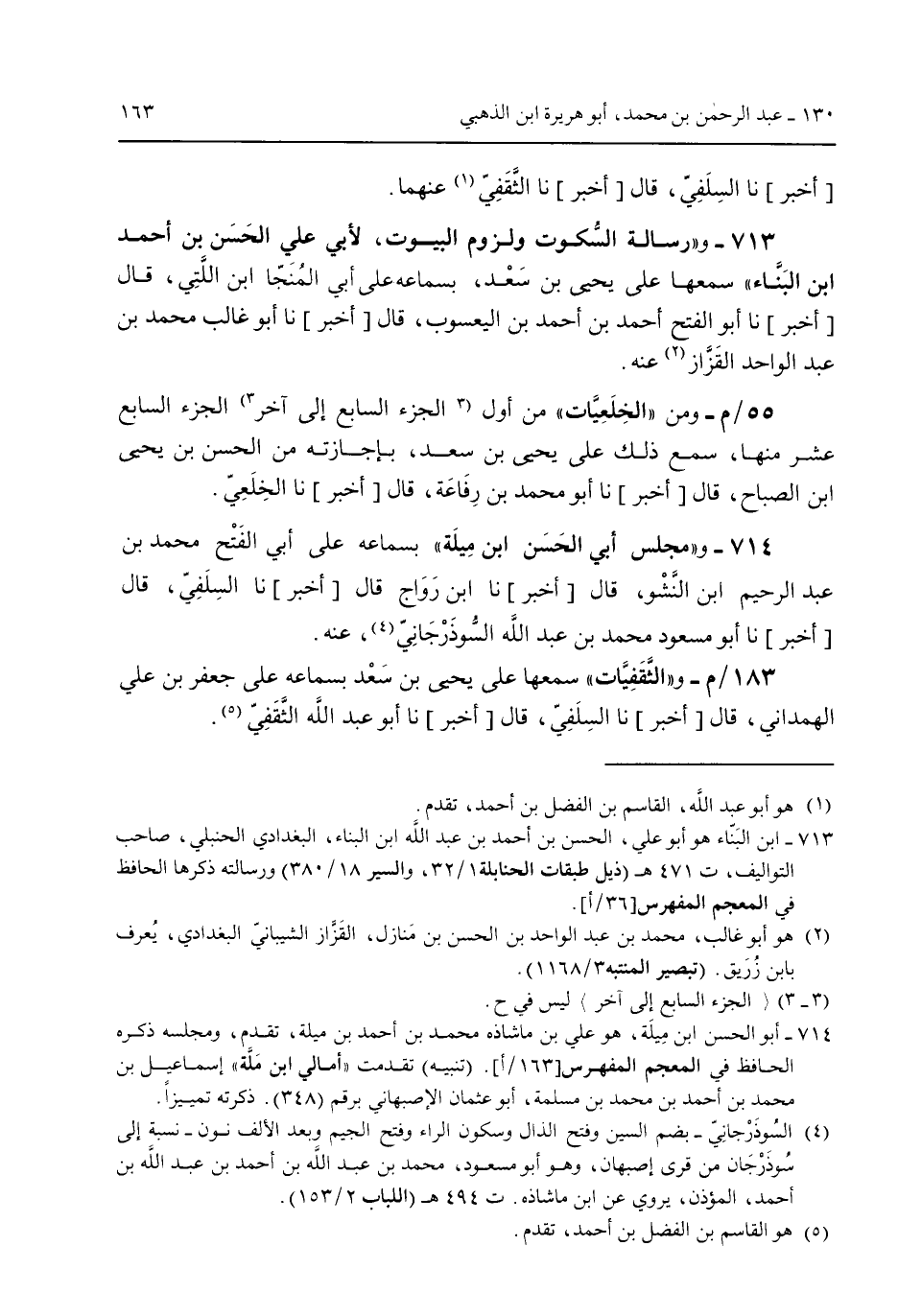 [أخبر] نا السلفي قال [أخبر] نا الثقفي عنهما.713 - و"رسالة السكوت ولزوم البيوت لأبي علي الحسن بن أحمد ابن البناء" سمعها على يحيى بن سعد بسماعه على أبي المُنجا ابن اللتي قال [أخبر] نا أبو الفتح أحمد بن أحمد بن اليعسوب قال [أخبر] نا أبو غالب محمد بن عبد الواحد القزاز عنه.