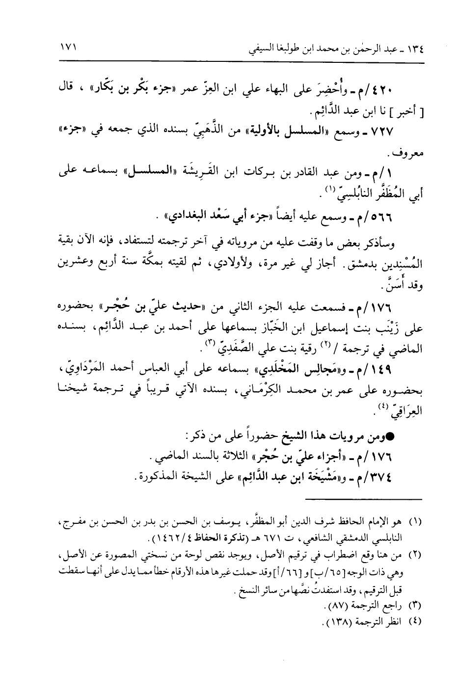 149/م- و"مجالس المخلدي" بسماعه على أبي العباس أحمد المرداوي بحضوره على عمر بن محمد الكرماني بسنده الآتي قريباً فى ترجمة شيخنا العراقي. ومن مرويات هذا الشيخ حضوراً على من ذكر: