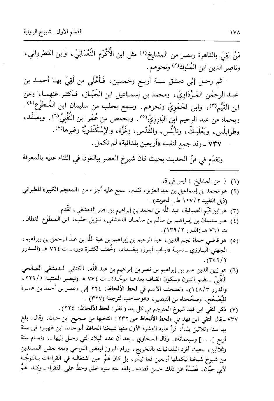 من بقي بالقاهرة ومصر من المشايخ مثل ابن الأكرم النعماني وابن القطرواني وناصر الدين ابن المُلوك ونحوهم. ثم رحل إلى دمشق سنة أربع وخمسين فأعلى من لقي بها أحمد بن عبد الرحمن المرداوي ومحمد بن إسماعيل ابن الخباز فأكثر عنهما وعن ابن القيم وابن الحموي ابن البارزي وبحمص من عُمر ابن النٌقبي وبصفد وطرابلس وبعلبك ونابلس والقدس وغزة والإسكندرية وغيرها. 737 - وقد جمع لنفسه "أربعين بلدانية" لم تكمل. وتقدم فى فن الحديث بحيث كان شيوخ العصر يبالغون فى الثناء عليه بالمعرفة