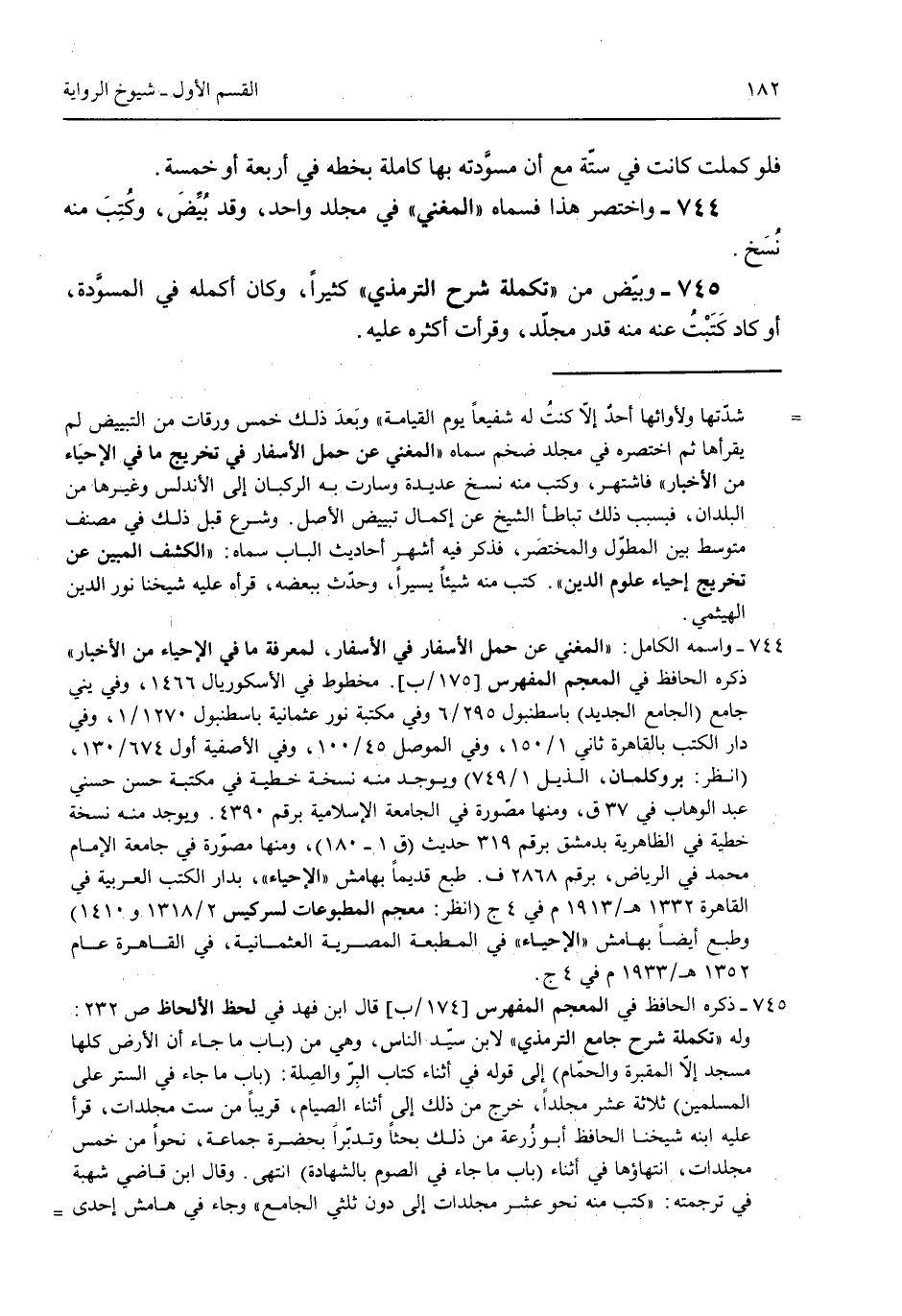 فلو كملت كانت فى ستة مع أن مسودته بها كاملة بخطه فى أربعة أو خمسة. 744 - واختصر هذا فسماه "المغني" فى مجلد واحد وقد بُيِّض وكُتب منه نُسخ. 745 - وبيّض من "تكملة شرح الترمذي" كثيراً وكان أكمله فى المسودة أو كاد كتبت عنه منه قدر مجلد وقرأت أكثره عليه.