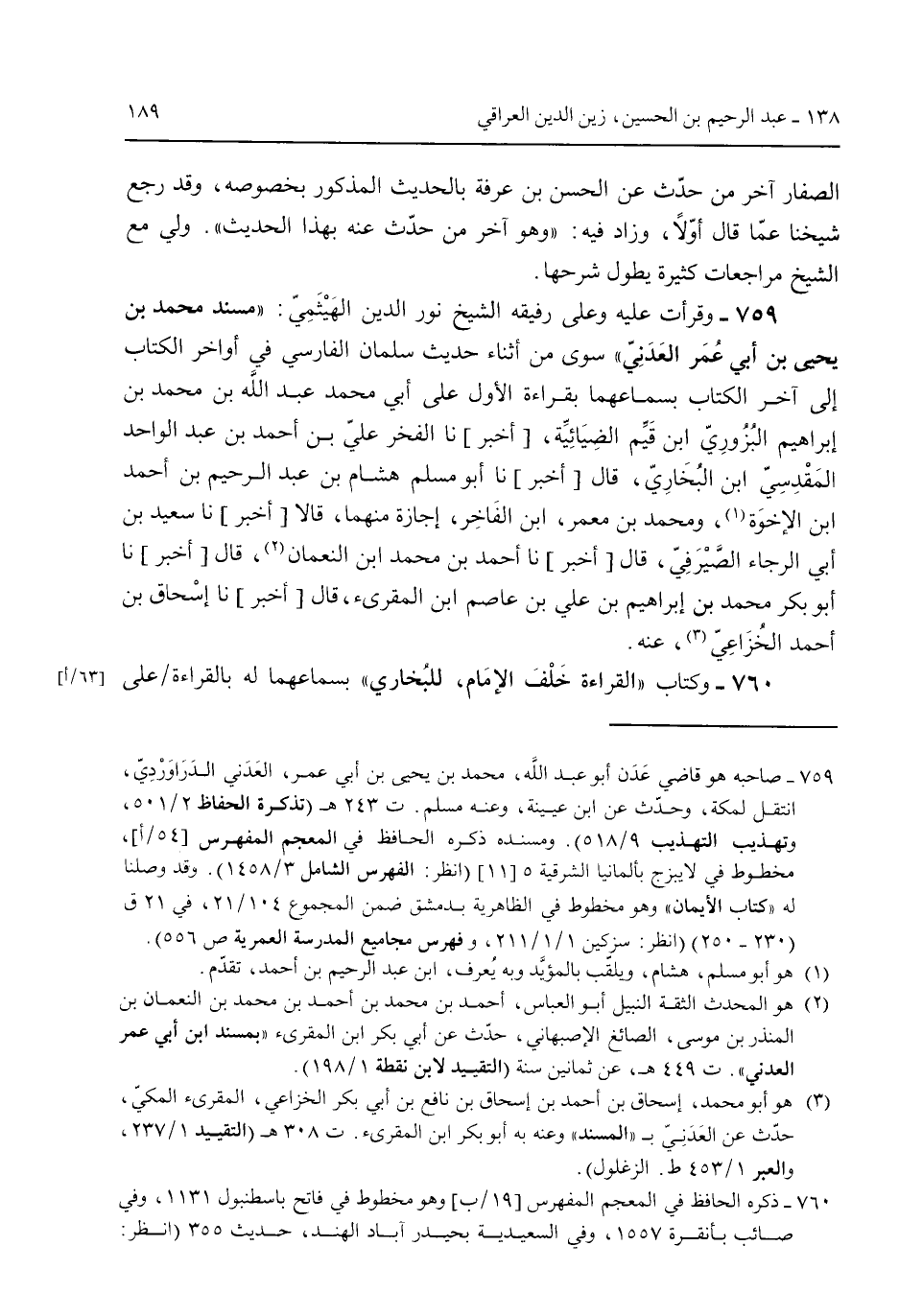 759 - وقرأت عليه وعلى رفيقه الشيخ نور الدين الهيثمي: "مسند محمد بن يحي بن أبي عُمر العدني" سوى من أثناء حيدث سلمان الفارسي في أواخر الكتاب إلى آخر الكتاب بسماعهما بقراءة الأول على أبي محمد عبد الله بن محمد بن إبراهيم البُزوزي ابن قيم الضيائية [أخبر] نا الفخر علي بن أحمد بن عبد الواحد المقدسي ابن البخاري قال [أخبر] نا أبو مسلم هشام بن عبد الرحيم بن أحمد ابن الإخوة ومحمد بن معمر ابن الفاخر إجازة منهما قالا [أخبر] نا سعيد بن أبي الرجاء الصيرفي قال [أخبر] نا أحمد بن محمد ابن النعمان قال [أخبر] نا أبو بكر محمد بن إبراهيم بن علي بن عاصم ابن المقرئ قال [أخبر] نا إسحاق بن أحمد الخُزاعي عنه. 760 - وكتاب "القراءة خلف الإمام للبخاري" بسماعهما له بالقراءة على