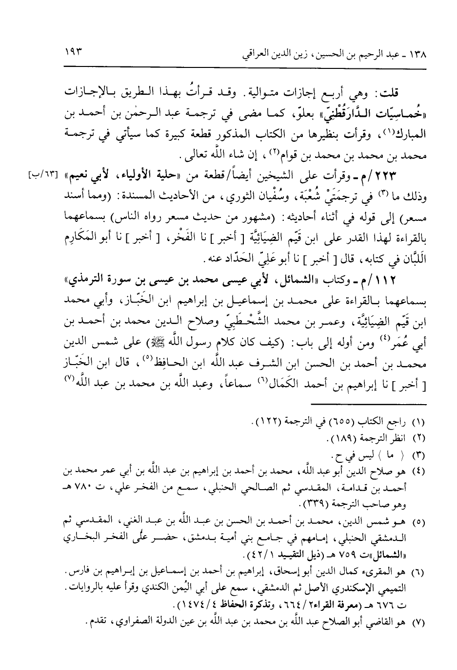 قلت: وهي أربع إجازات متوالية. وقد قرأت بهذا الطريق بالإجازات "خماسيات الدراقطني" بعلوّ كما مضى فى ترجمة عبد لارحمن بن احمد بم المبارك وقرأت بنظيرها من الكتاب المذكور قطعة كبيرة كما سيأتي فى ترجمة محمد بن محمد بن محمد بن قوام إن شاء الله تعالى. 223/م- وقرات على الشيخين أيضاً قطعة من "حلية الأولياء لأبي نعيم" وذلك مافي ترجمتي شعبة وسفيان الثوري من الأحاديث المسنده: (ومما أسند مسعر) إلى قوله فى أثناء أحاديثه: (مشهور من حديث مسعر رواه الناس) بسماعهما بالقراءة لهذا القدر على ابن قيم الضيائية [أخبر] نا الفخر [أخبر] نا أبو المكارم اللبان في كتابه قال [أخبر] نا أبو علي الحداد عنه. 112/م- وكتاب "الشمائل لأبي عيسى محمد بن عيسى بن سورى الترمذي" بسماعهما بالقراءة على محمد بن إسماعيل بن إبراهيم ابن الخباز وأبي محمد ابن قيم الضيائية وعمر بن محمد الشحطبي وصلاح الدين محمد بن أحمد بن أبي عُمر ومن أوله إلى باب: (كيف كان كلام رسول الله صلى الله عليه وسلم) على شمس الدين محمد بن أحمد بن الحسن ابن الشرف عبد الله ابن الحافظ قال ابن الخباز [أخبر] نا إبراهيم بن أحمد الكمال سماعاً وعبد الله بن محمد بن عبد الله