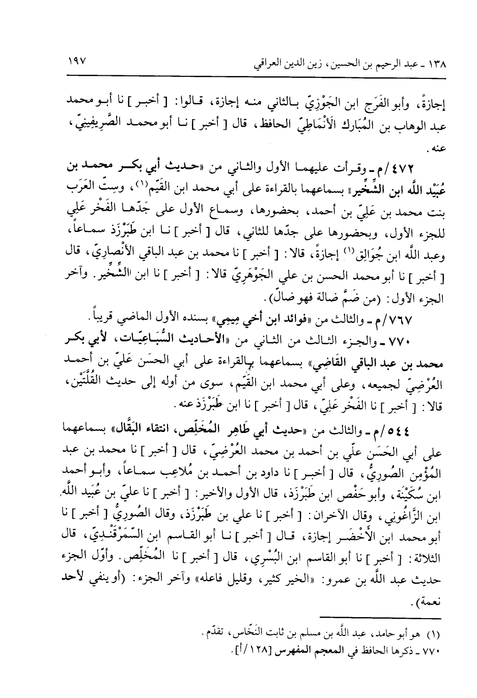 إجازة وأبو الفرج ابن الجوزي بالثاني منه إجازة قالوا [أخبر] نا أبو محمد عبد الوهاب بن المُبارك الأنماطي الحافظ قال [أخبر] نا أبو محمد الصيرفيني عنه.472/م- وقرات عليهما الأول والثاني من "حديث أبي بكر محمد بن عبيد الله ابن الشخير" بسماعهما بالقراءة على أبي محمد ابن القيم وست العرب بنت محمد بن علي بن أحمد بحضورها وسماع الأول على جدها الفخر علي للجزء الأول وبحضورها على جدا للثاني قال [أخبر] نا ابن طبرزذ سماعاً وعبد الله ابن جُوالق إجازة قالا [أخبر] نا محمد بن عبد الباقي الأنصاري قال [أخبر] نا أبو محمد الحسن بن علي الجوهري قالا [أخبر] نا ابن الشخير. وآخر الجزء الأول: (من ضم ضالة فهو ضال).767/م- والثالث من "فوائد ابن أخي ميمي" بسنده الأول الماضي قريباً.770 - والجزء الثالث من الثاني من "الأحاديث السباعيات لأبي بكر محمد بن عبد الباقي القاضي" بسماعهما بالقراءة على أبي الحسن علي بن أحمد العُرضي لجميعه وعلى أبي محمد ابن القيم سوى من أوله إلى حديث القُلتين قالا [أخبر] نا الفخر علي قال [أخبر] نا ابن طبرزذعنه.544/م- والثالث من "حديث أبي طاهر المخلص انتقاء البقال" بسماعهما على أبي الحسن علي بن أحمد بن محمد العُرضي قال [أخبر] نا محمد بن عبد المؤمن الصوري قال [أخبر] نا داود بن أحمد بن مُلاعب سماعاً وأبو أحمد ابن سُكينة وأبو حفص ابن طبرزذ قال الأول والأخير [أخبر] نا علي بن عبيد الله ابن الزاغوني قال الآخران [أخبر] نا علي بن طبرزذ قال الصوري [أخبر] نا أبو محمد ابن الأخضر إجازة قال [أخبر] نا أبو القاسم ابن السمرقندي قال الثلاثة: [أخبر] نا أبو القاسم ابن البُسري قال [أخبر] نا المُخلص وأول الجزء حديث عبد الله بن عمرة: "الخير كثير وقليل فاعله" وآخر الجزء: (أو ينفي لأحد نعمة).