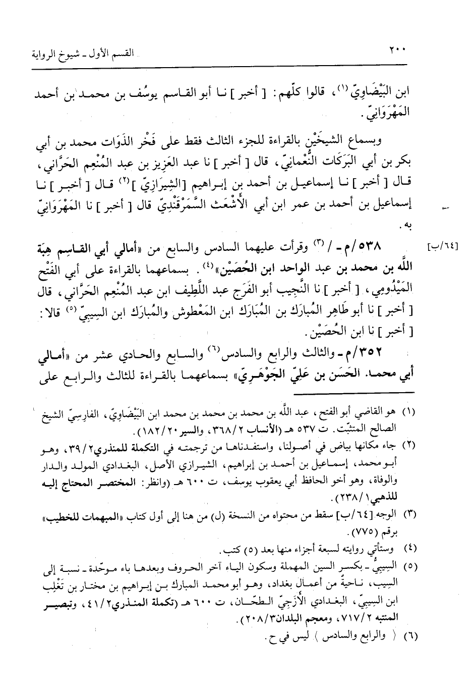538/م- وقرأت عليهما السادس والسابع من "أمالي أبي القاسم هبة الله بن محمد بن عبد الواحد ابن الحصين" بسماعهما بالقراءة على أبي الفتح الميدومي [أخبر] نا النجيب أبو الفرج عبد اللطيف ابن عبد المنعم الحراني قال [أخبر] نا أبو طاهر المبارك بن المبارك ابن المعطوش والمبارك ابن السيبي قالا [أخبر] نا ابن الحصين. 352/م- والثالث والرابع والسادس والسابع والحادي عشر من "أمالي أبي محمد الحسن بن علي الجوهري" بسماعهما بالقراءة للثالث والرابع على
