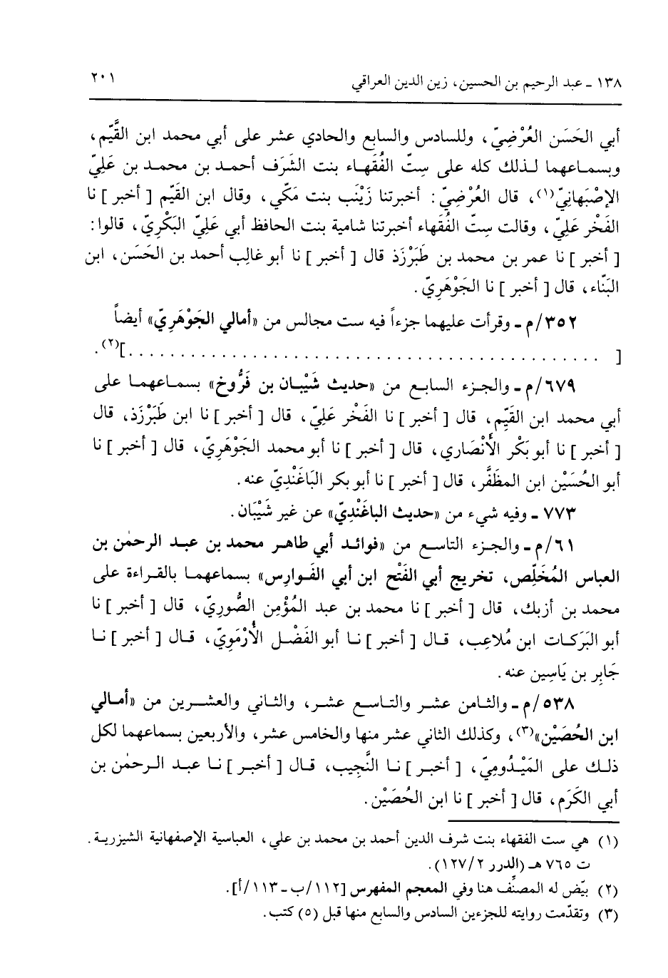 أبي الحسن العُرضي وللسادس والسابع والحادي عشر على أبي محمد ابن القيم وبسماعهما لذلك كله على ست الفقهاء بنت الشرف أحمد بن محمد بن علي الإصبهاني قال العُرضي: أخبرتنا زينب بنت مكي وقال ابن القيم [أخبر] نا الفخر علي وقالت ست الفقهاء أخبرتنا شامية بنت الحافظ أبي علي البكري قالوا [أخبر] نا عمر بن محمد بن طبرزذ قال [أخبر] نا أبو غالب أحمد بن الحسن ابن البناء قال [أخبر] نا الجوهري. 352/م- وقرأت عليهما جزءاً فيه ست مجالس نمن "أمالي الجوهري" أيضاً 679/م- والجزء السابع من "حديث شيبان بن فروخ" بسماعهما على أبي محمد ابن القيم قال [أخبر] نا الفخر علي قال [أخبر] نا ابن طبرزذ قال [أخبر] نا أبو بكر الأنصاري قال [أخبر] نا أبو محمد الجوهري قال [أخبر] نا أبو الحسين ابن المظفر قال [أخبر] نا أبو بكر الباغندي عنه.